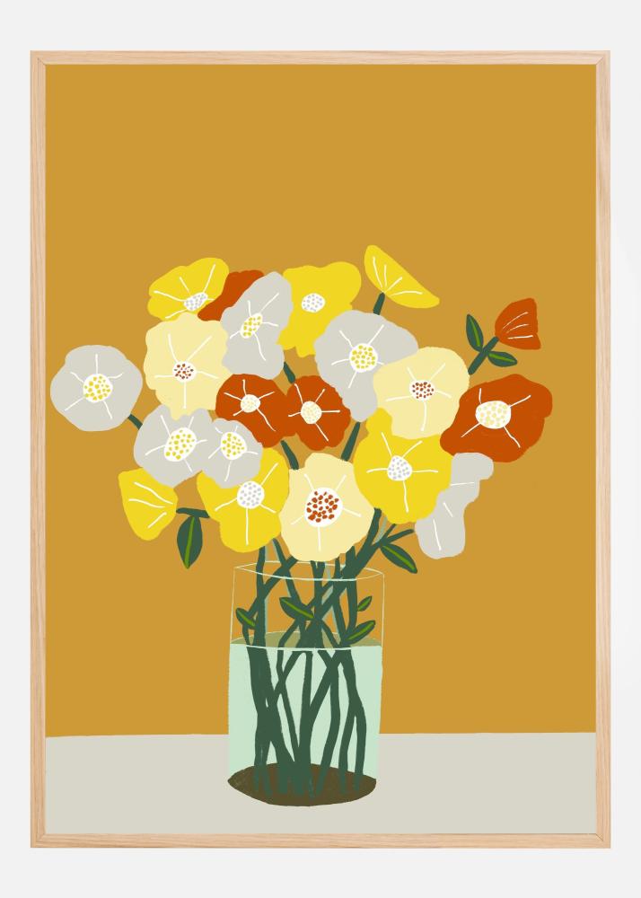 Färgpaletten i denna print domineras av varma och harmoniska nyanser, inklusive orange, gult och vitt, vilket ger en känsla av glädje och energi. Den bruna bakgrunden förstärker blommornas färger och skapar ett vackert djup i bilden. Postern passar väl in i olika inredningsstilar, från det moderna till det klassiska. Denna affisch blir en fantastisk detalj i vilket rum som helst, från vardagsrum till kontor.