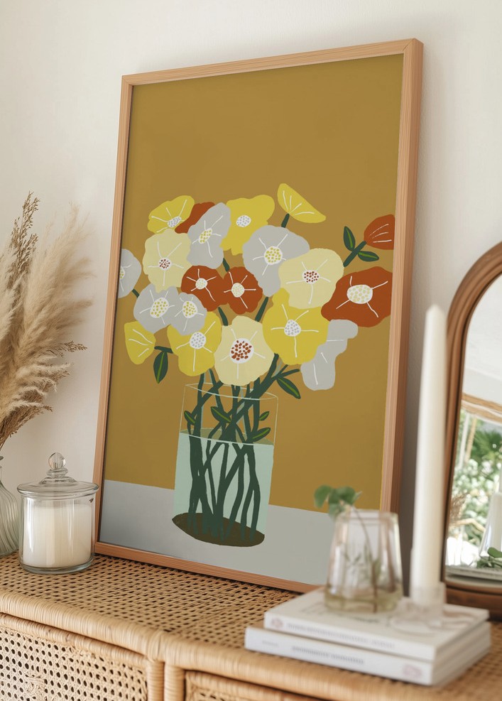 Det här motivet är en vacker poster som föreställer en stiliserad bukett med blomster i en glasvas. Blommorna är skapade i en modern och minimalistisk design som fångar ögat med sin färgrika charm. Perfekt för att tillföra en känsla av natur och elegans till ditt hem. Mönstret i motivet gör det till en utmärkt affisch för den som vill ha något stilrent och trendigt på väggen.