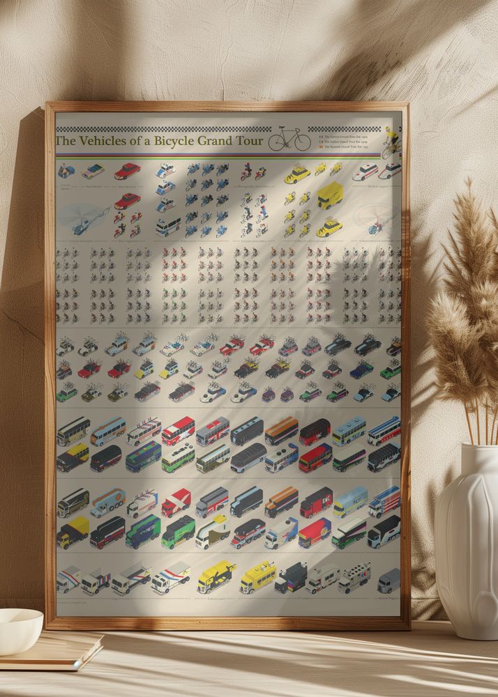 Denna detaljrika affisch vid namn "The Vehicles of a Bicycle Grand Tour" är en hyllning till cykelkulturen och dess inflytande i olika transportmedel. Affischen är en grafisk framställning som kreativt visar en mängd fordon, från små cyklar till större bussar, organiserade i ett rytmiskt mönster som påminner om en startlista. De lekfulla illustrationerna kombinerar charm och nostalgi och passar perfekt för cykelentusiaster eller samlare av unika posters.