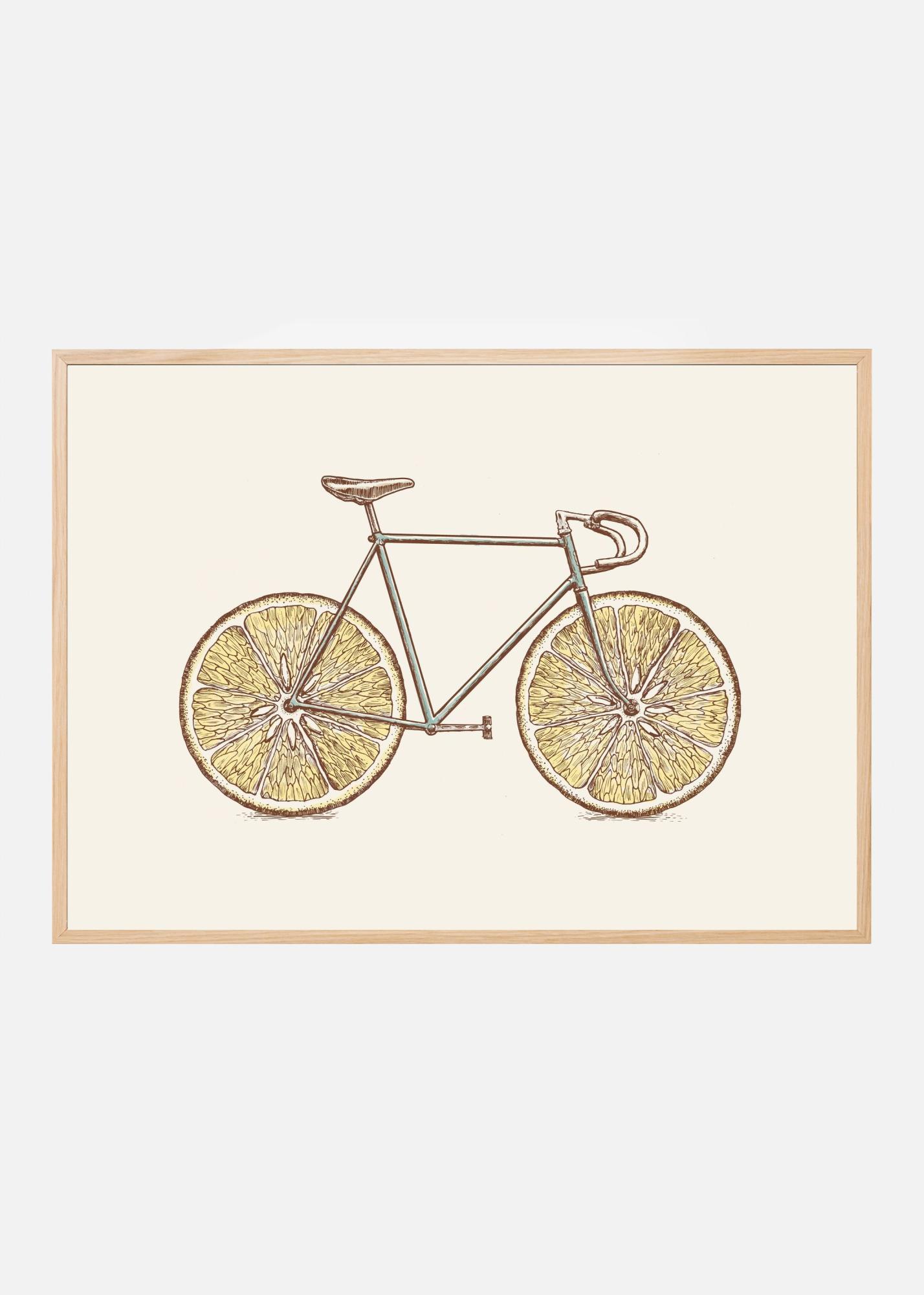 Färgerna i denna affisch är noggrant avvägda för att skapa en behaglig och estetisk balans. Den realistiska illustrationen av cykeln är utförd i jordiga toner av brun och beige, medan citronhjulen tillför ljusa inslag av gult och grönt. De detaljerade skuggningarna och konturerna ger motivet ett intryck av djup och textur, vilket gör denna poster till en iögonfallande och samtida konstbit som lätt kan integreras i olika färgscheman och designstilar.