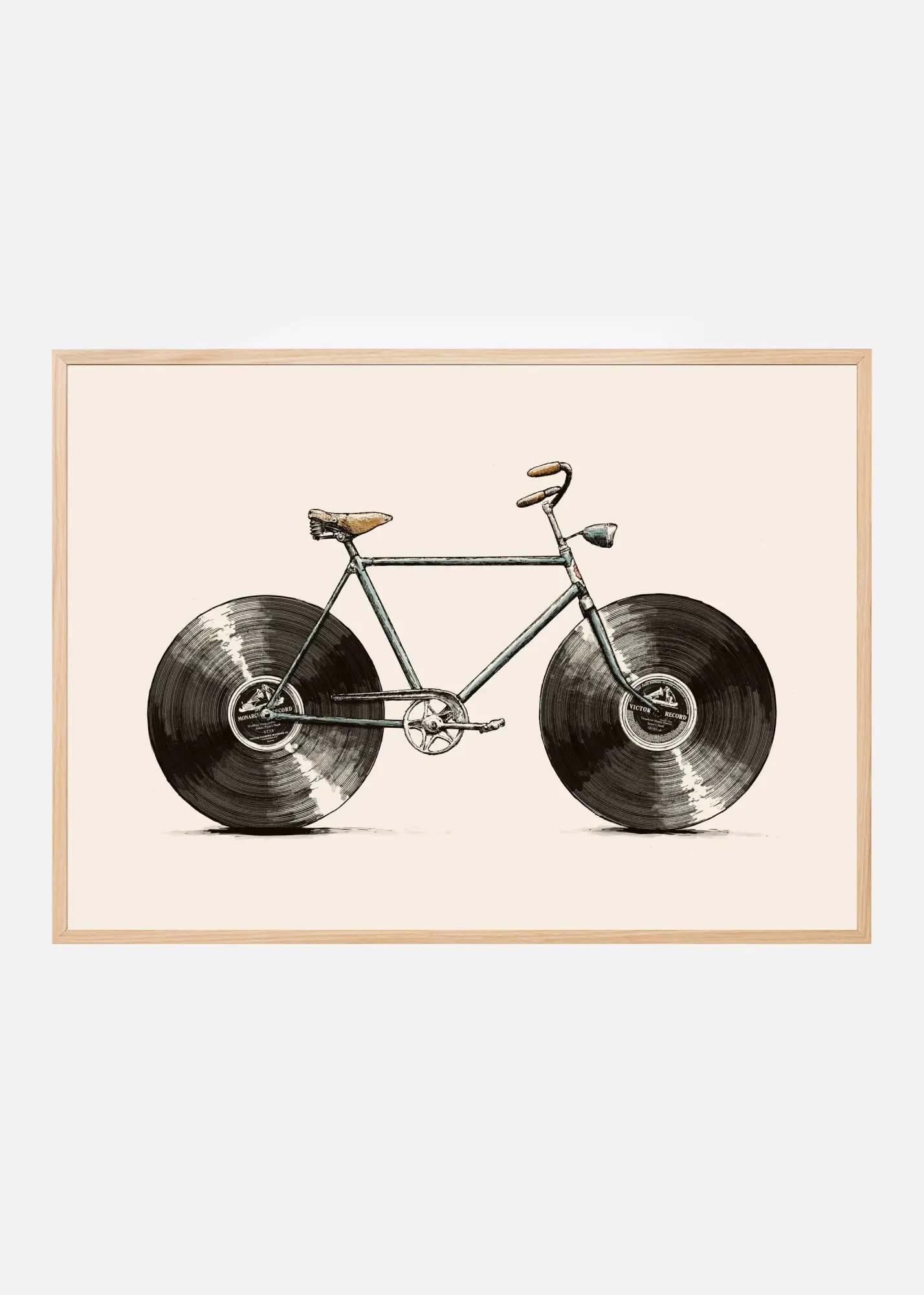 Denna unika och stilrena poster föreställer en cykel med vinylskivor som hjul. Motivet blandar musikens och cykelns värld på ett fantasifullt och konstnärligt sätt, och blir en perfekt inredningsdetalj för alla som älskar både musik och design. Printens kreativa twist ger en retrokänsla samtidigt som den håller sig modern och trendig.