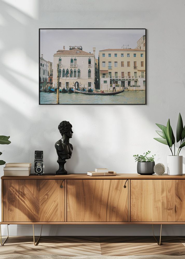 Denna poster fångar den tidlösa skönheten av Venedigs ikoniska kanaler, där gondoler glider mjukt förbi de charmiga byggnaderna. Bilden väcker känslan av elegans och historia, perfekt för att skapa en sofistikerad och stilren atmosfär i vilket rum som helst. Låt detta print bli en central del av din inredning och bjud in en touch av Italiens romantiska arkitektur i ditt hem.