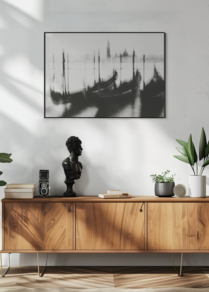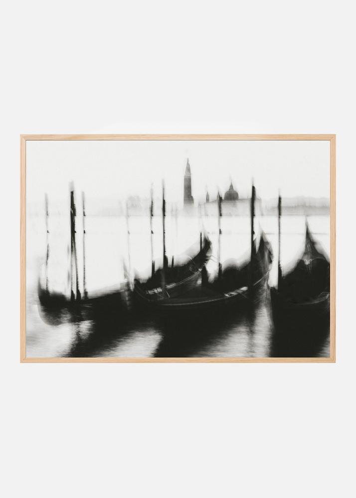 Upptäck en fascinerande poster med ett konstnärligt motiv som fångar essensen av en dimhöljd dag i Venedig. Denna svartvita print skildrar gondoler som vilar vid kajen med den historiska staden i bakgrunden. Den subtila oskärpan ger en drömlik känsla och lockar till en nostalgisk resa genom den romantiska kanalstaden. Perfekt för att lägga till en elegant och tidlös touch till vilket rum som helst.