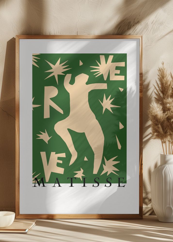 Denna stilrena poster fångar ögat med ett motiv inspirerat av konstnären Matisse. Affischen har en minimalistisk design som kombinerar en djup grön bakgrund med beige siluetter och former, vilket ger bilden ett harmoniskt och balanserat uttryck. Motivet består av abstrakta figurer och stjärnliknande mönster som skapar en känsla av rörelse och kreativitet.