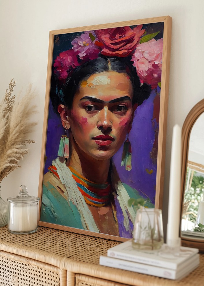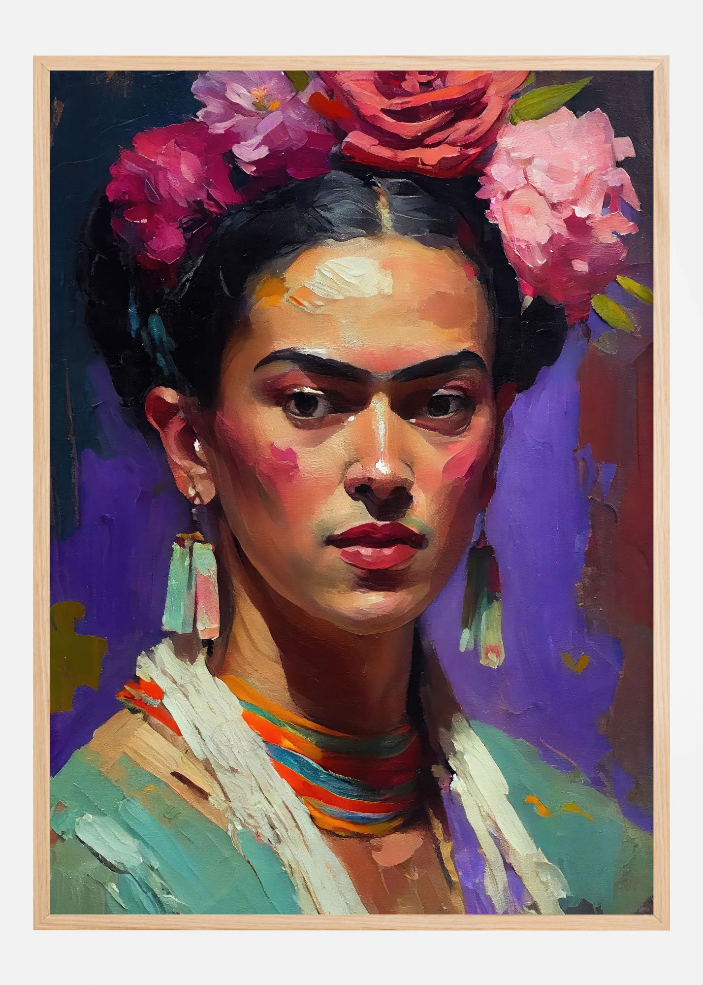 Denna vackra affisch fångar en fängslande porträtt av en kvinna med blommor i håret. Konstverket framhäver ett uttrycksfullt ansikte med subtila detaljer som ger en tidlös känsla till postern. Den konstnärliga stilen i printen betonar de färggranna inslagen och skapar en kraftfull visuell upplevelse.