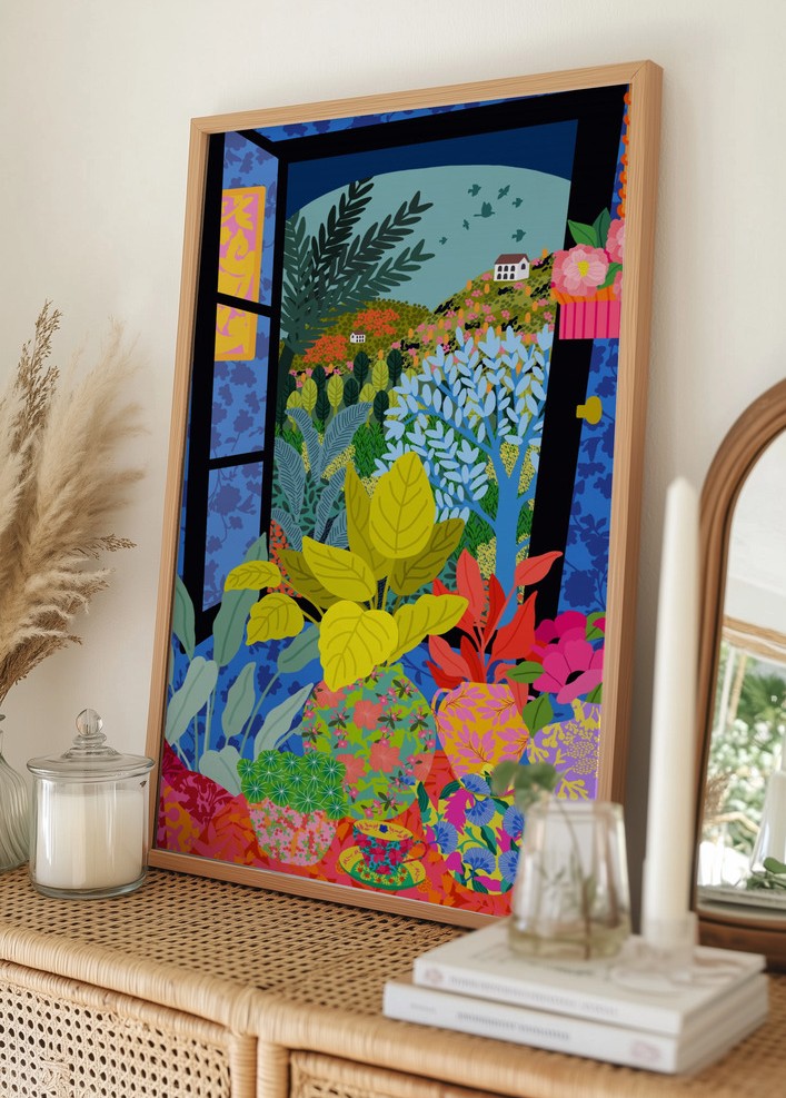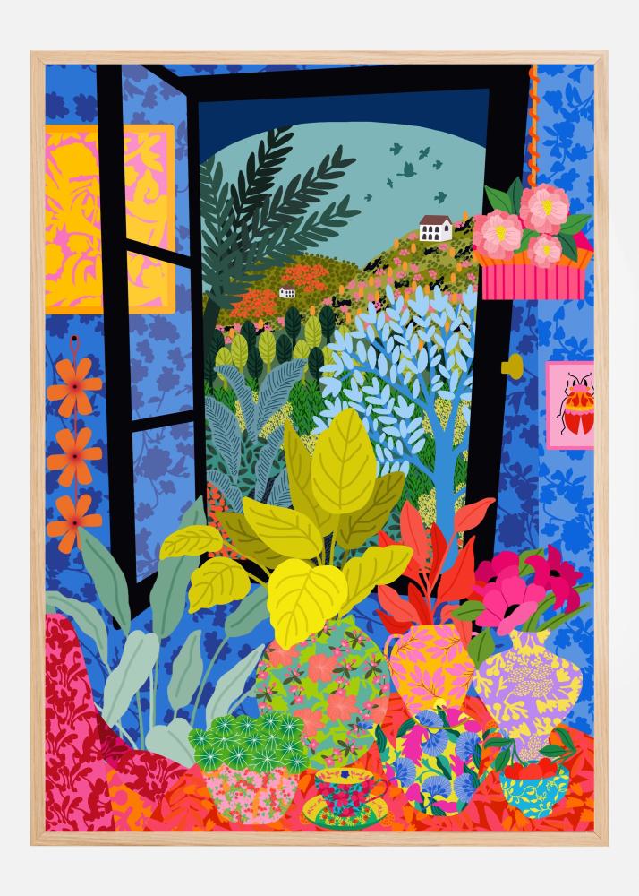 Denna färgsprakande poster fångar blicken med sitt lekfulla motiv av en öppen fönsterram som bjuder in till en värld fylld av liv och natur. Bjärta färger dominerar affischen där man kan se en frodig samling av växter i olika nyanser av grönt, gult, rosa och rött. Genom fönstret skymtar en pittoresk landskapsvy med ett litet hus och böljande kullar, perfekt för att drömma sig bort till lugnet på landsbygden.
