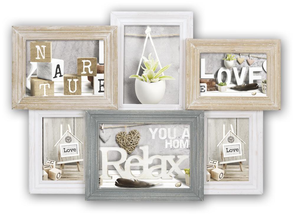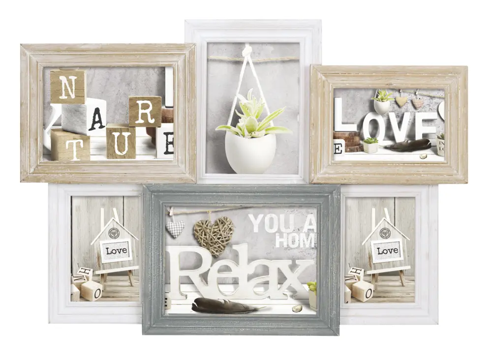 Låt denna charmiga kollageram tillföra en naturnära och avslappnad känsla till ditt hem! Ramen har plats för 6 stycken bilder i olika format. Listerna går i träfärgat, grått och vitt med slitna detaljer.