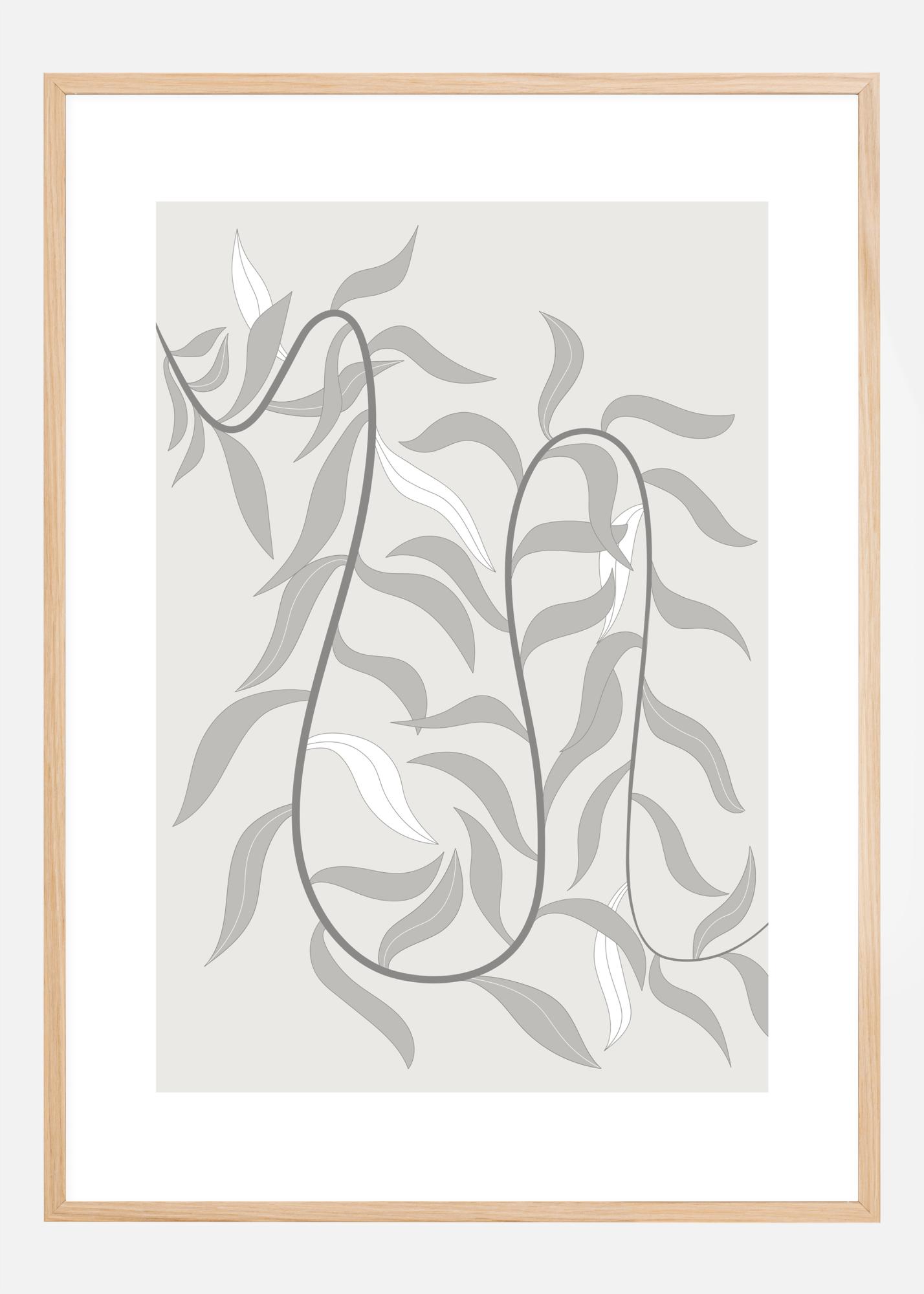 En abstrakt botanisk poster med en krypande vinstock som slingrar sig fram över postern. Designen är en enkel tryckstil med bladen i ljusgrått och vitt. En mörkgrå vinstock slingrar sig mellan bladen och förenar allt i en slingrande form. Kombinera med en mjuk grön vägg för att få en löveffekt.