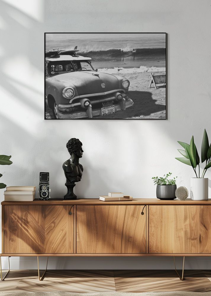 Denna svartvita poster fångar en nostalgisk strandscen med en gammal bil parkerad vid vattnet, vilket ger en känsla av äventyr och retrostil. Surfaren i bakgrunden kompletterar den avslappnade atmosfären perfekt, och motivet är idealt för den som älskar både klassiska bilar och surfkultur. Perfekt som print för att tillföra en vintage-charm till ditt hem eller kontor.