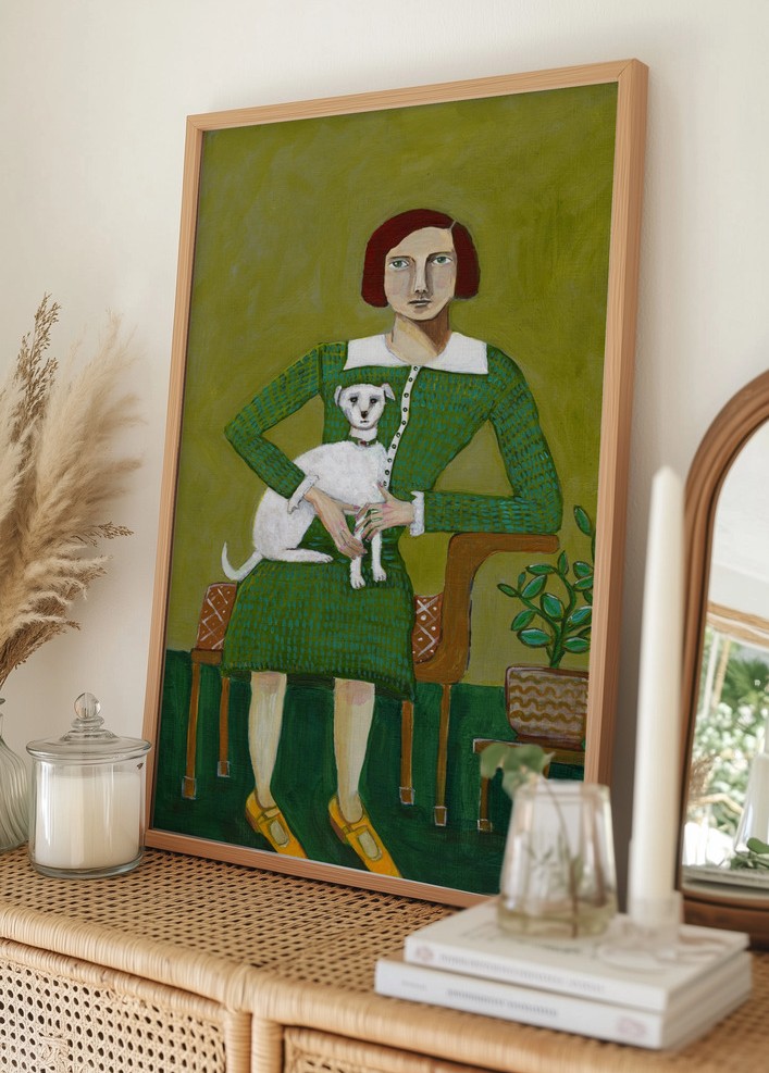 Färgerna i denna affisch är lugnande och harmoniska, med en övervägande palett av dämpad grönt och inslag av vitt i hundens päls och klänningens detaljer. De bruna och gula tonerna i klädseln och möblerna skapar en balanserad komposition, medan växtens grönska adderar en naturlig touch. Perfekt som en unik print för den konstintresserade kunden!