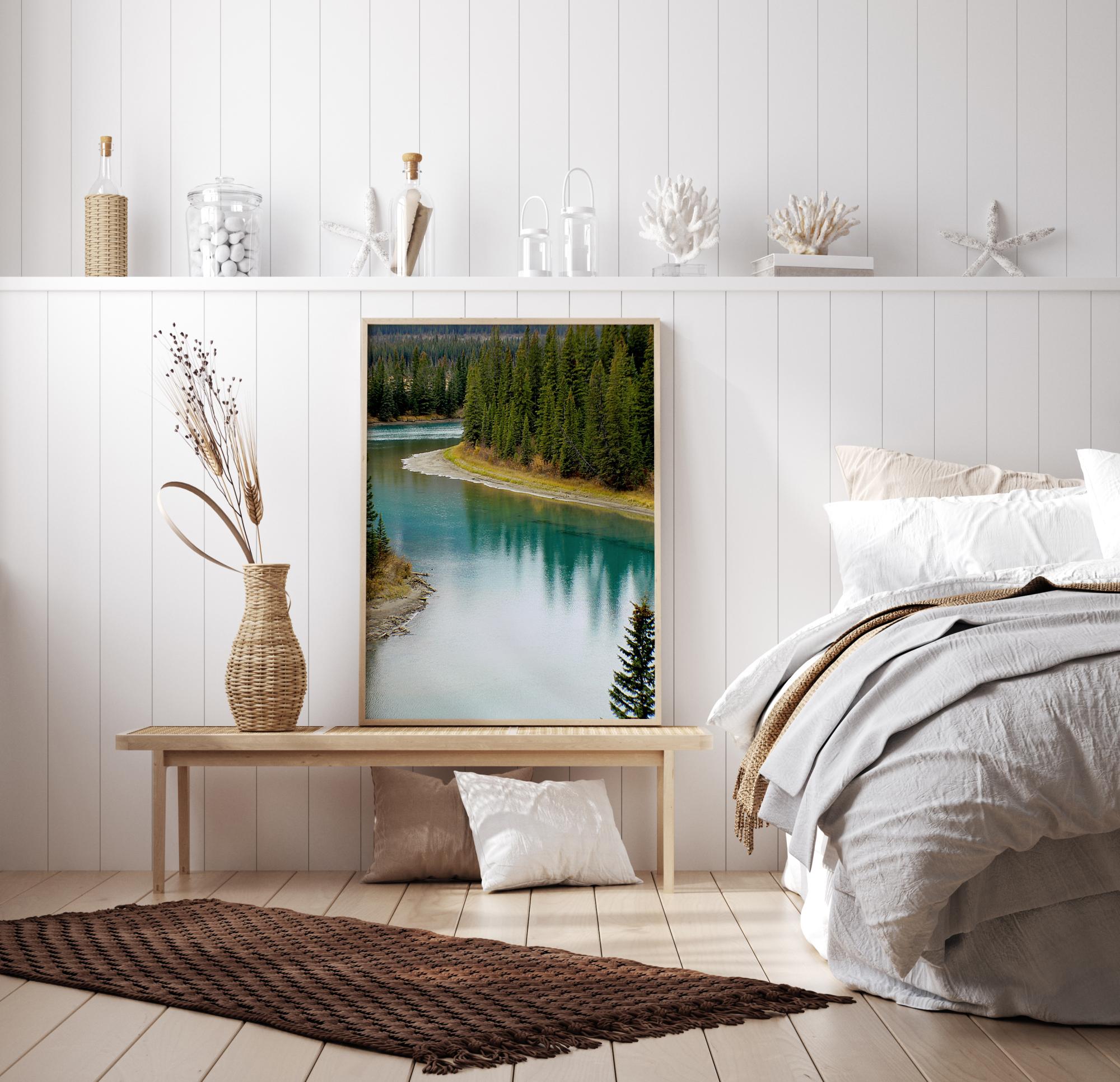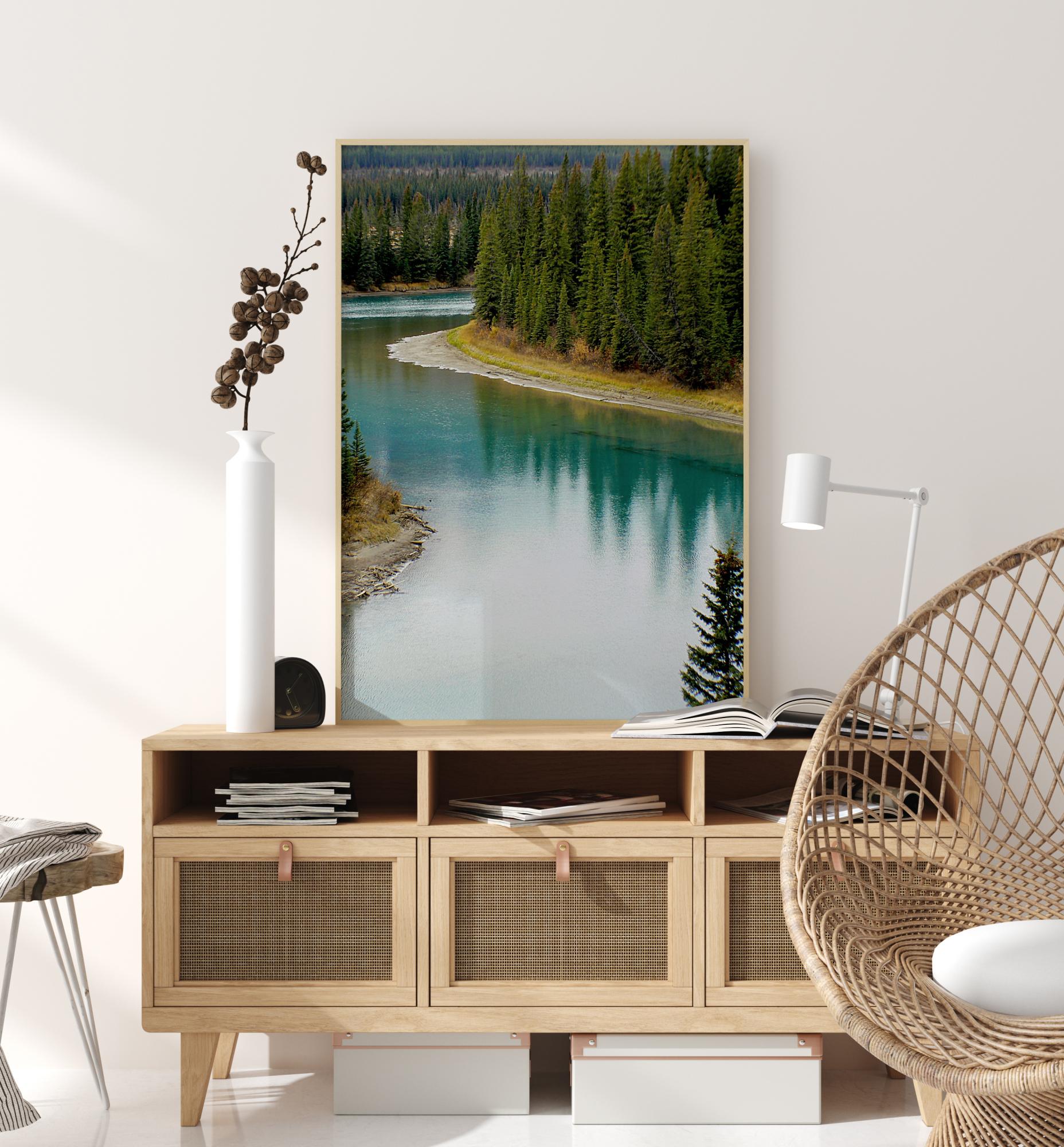 En skogsposter där granar kantar stranden av en bred flod som svänger sin väg genom landsbygden. De gröna träden står höga när skogen försvinner i fjärran. Den breda floden är nästan regnbågsfärgad och fångar trädens höga spetsiga reflektioner på dess yta.
