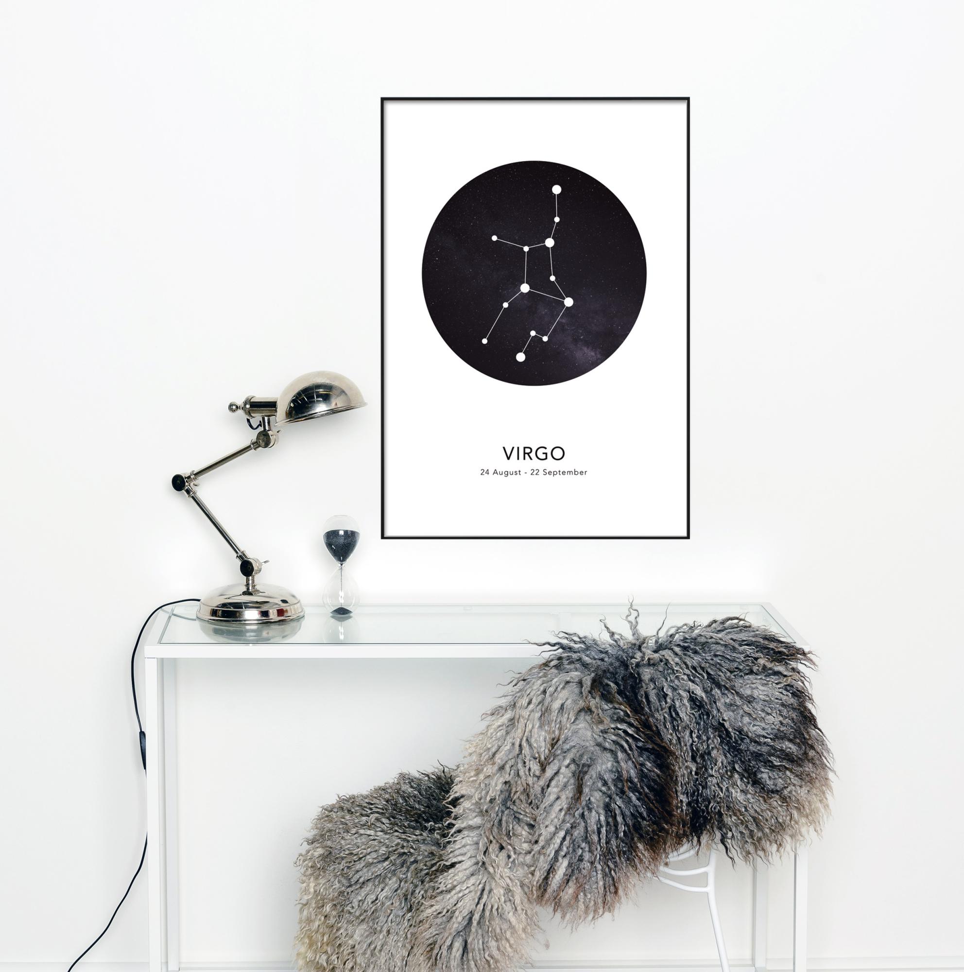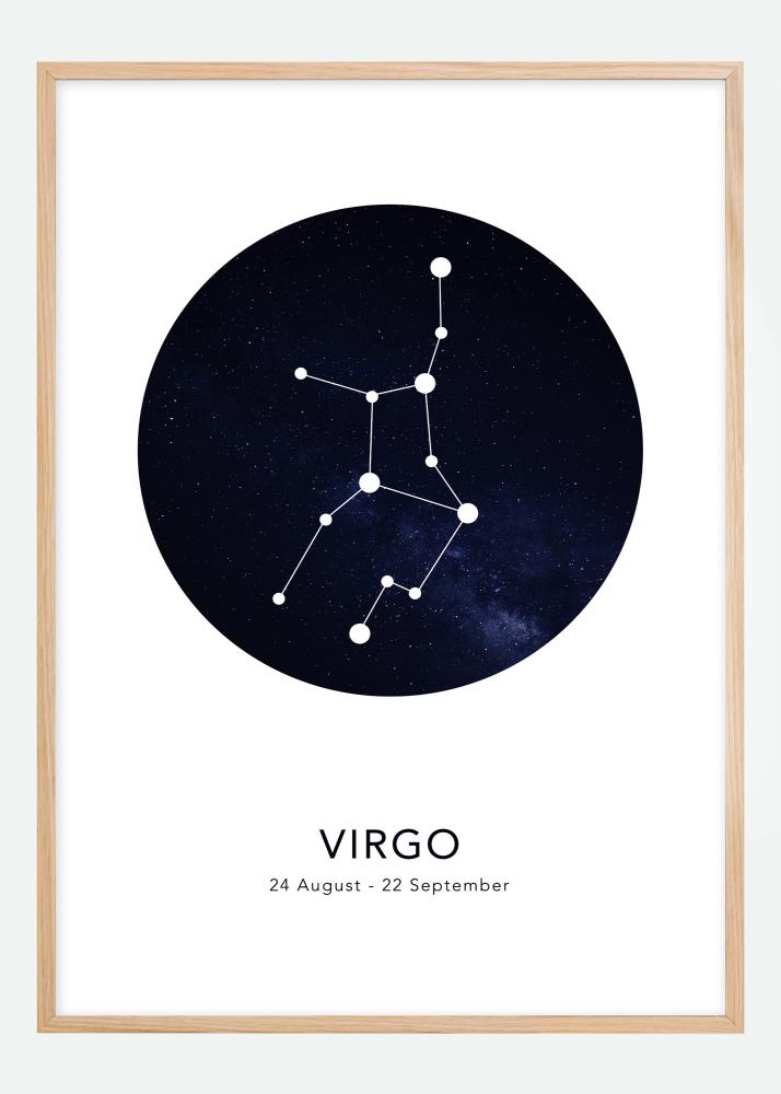 Ge bort en personlig tavla till någon som du tycker om! Den här stilsäkra planschen har motiv av stjärntecknet Jungfrun mot en bakgrund i form av en svart och blå stjärnhimmel. Nedanför finns namnet tillsammans med gällande datum på engelska.