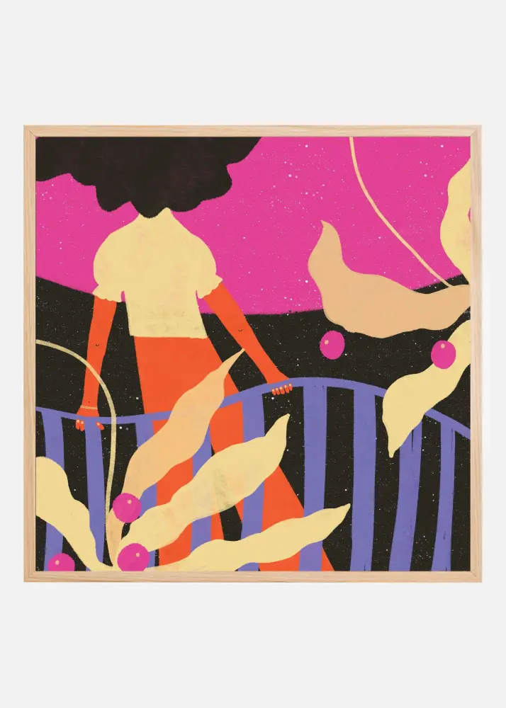 Vår affisch är perfekt för den som vill tillföra en konstnärlig och samtida känsla i sitt hem. Figurens dynamiska afrofrisyr, detaljerade med små prickar som simulerar stjärnklar natthimmel, står i stark kontrast mot bakgrunden där himmelska kroppar och abstrakta vegetativa former dansar i harmoni. Denna mångfacetterade komposition är en visuell fest för ögat och kan tjäna som ett inspirerande fokuspunkt i vilket rum som helst.