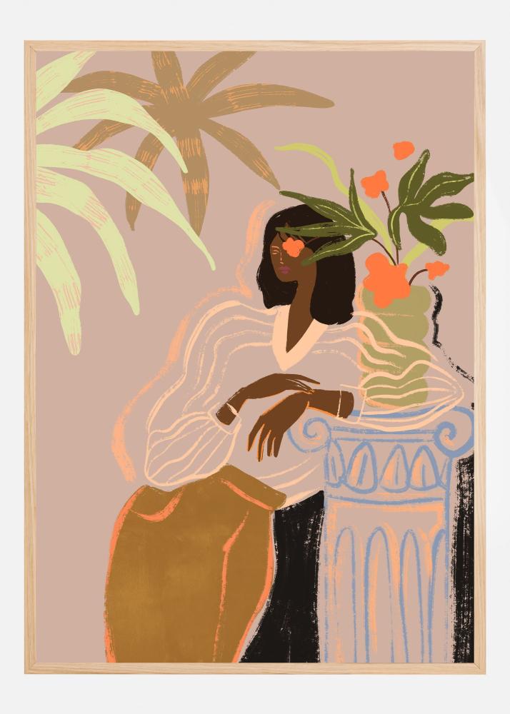 Denna moderna och stilmedvetna poster skildrar en avslappnad stämning med en kvinnlig figur i en trendmedveten miljö. Motivet präglas av en lugn komposition där pastelliga och jordnära toner samverkar för att skapa en harmonisk känsla. Den kvinliga figuren, framställd i ett dekorativt och abstrakt uttryck, vilar sitt huvud mot en hand och strålar av ro och kontemplation.