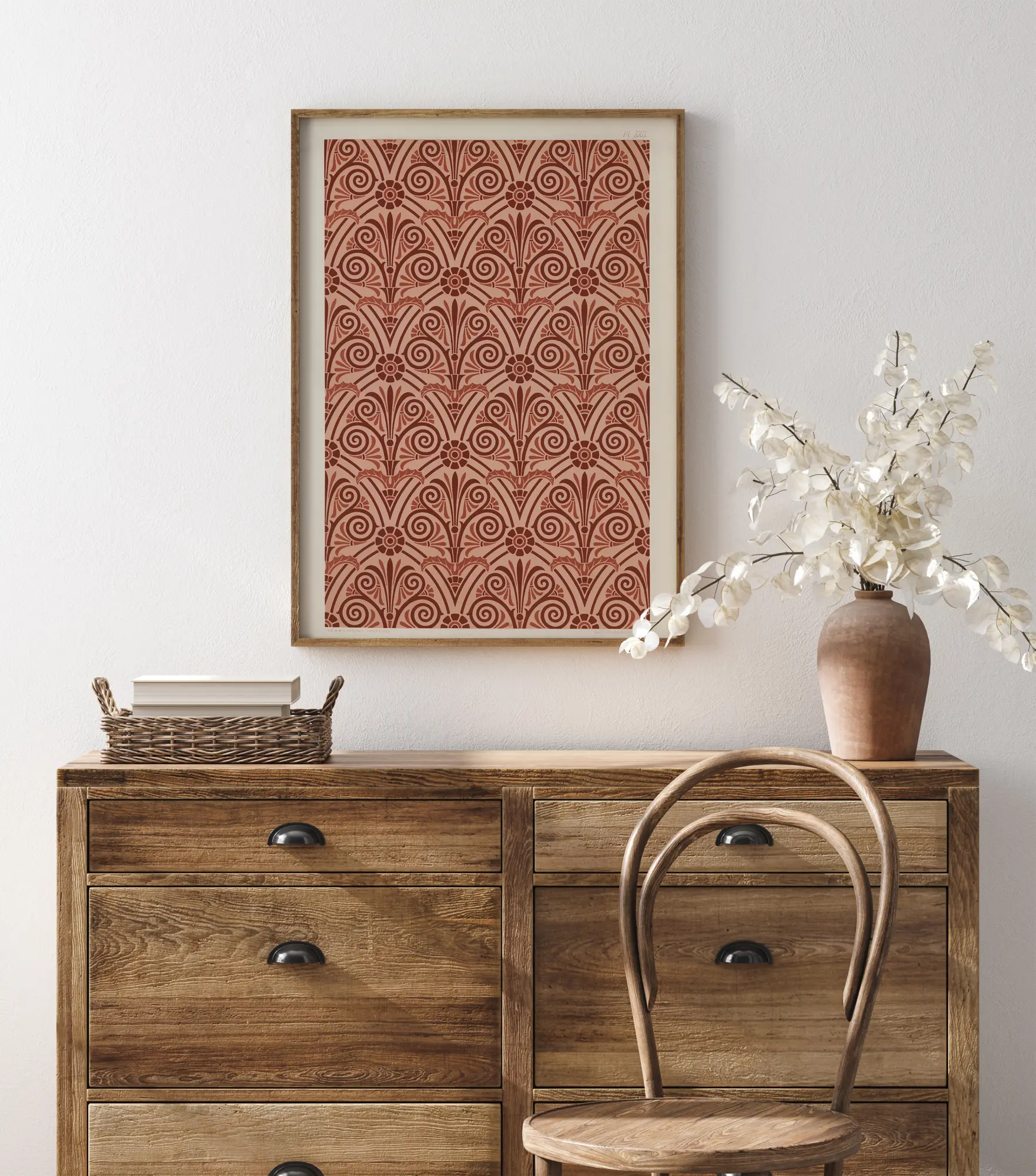 En ljust mönstrad poster med röda upprepande mönster. Inom mönstren finns krusade cirklar som ser ut som blad eller fransar. Det finns också blomformer med jämna mellanrum, vilket gör detta till ett botaniskt tryckmönster. Perfekt att tapetsera med, se vilka bilder du ser i dessa intrikata mönster.