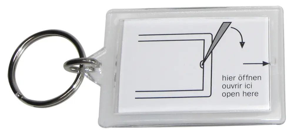 Starta ramväljaren »Ha med dina favoritbilder överallt! Snygg nyckelring i akrylplast med plats för 2 bilder (framsida och baksida) i 3,5x4,5 cm.