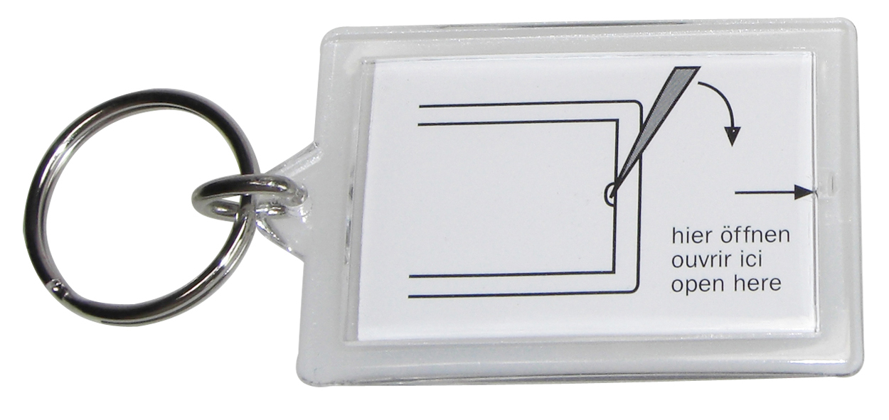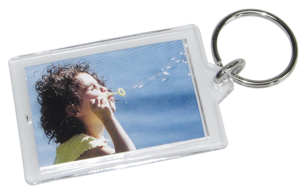 Ha med dina favoritbilder överallt! Snygg nyckelring i akrylplast med plats för 2 bilder (framsida och baksida) i 3,5x4,5 cm.