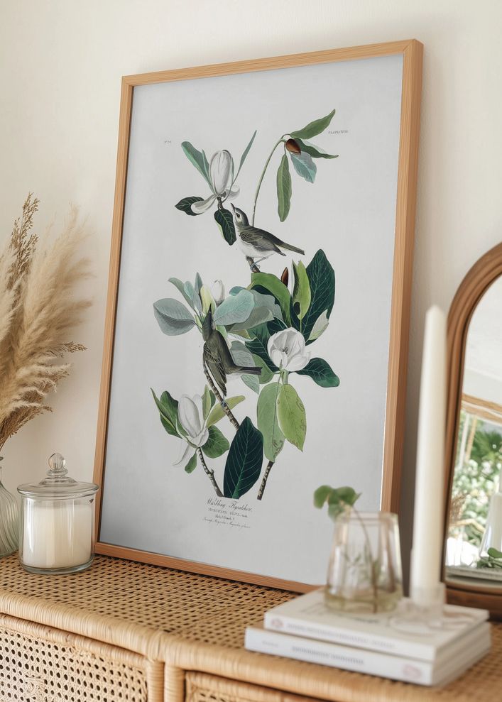 Denna eleganta poster fångar skönheten hos naturens flora och fauna. Motivet visar detaljerade illustrationer av fåglar som vilar bland magnoliablad och blommor, vilket ger en känsla av liv och rörelse mitt i en stillsam miljö. Perfekt för att skapa en lugn och harmonisk atmosfär i vilket rum som helst, passar denna affisch både i moderna och klassiska interiörer.