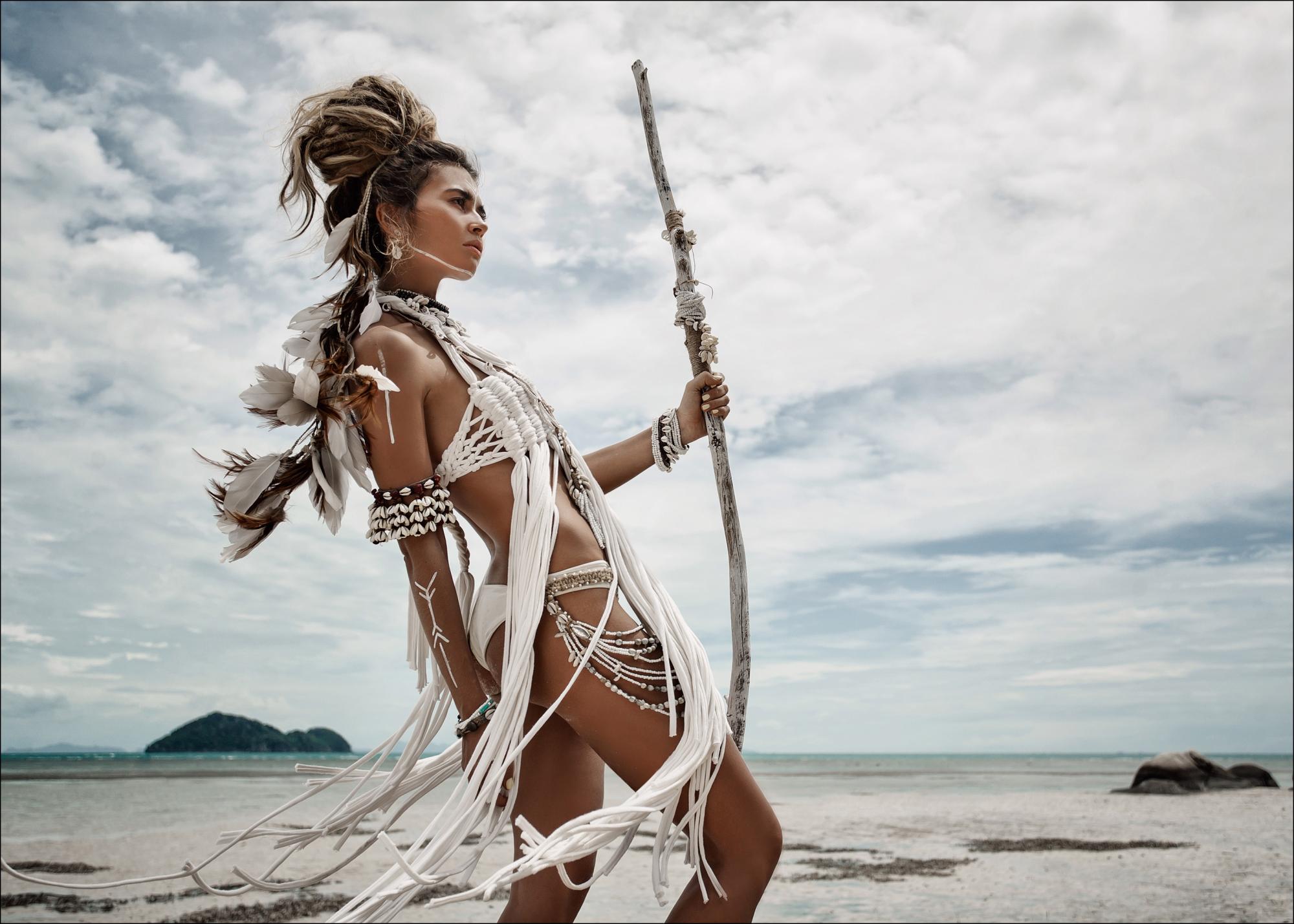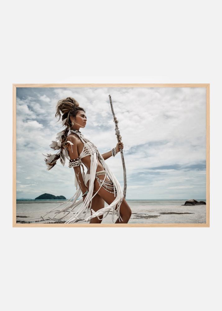 En krigarposter med en ung kvinna som poserar på en strand klädd i ljusa stamkläder. Hennes solbrända hud kontrasterar mot de vita flödande plagg och smycken som täcker hennes kropp och som slingrar sig genom hennes hår. Hennes kraftfulla pose får extra tyngd av den långa stång hon bär i sin vänstra hand när hon stirrar mot sina fiender.