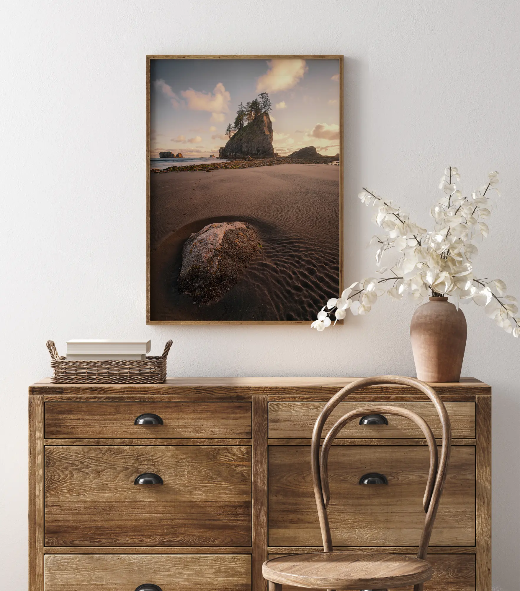 En naturskön poster med en närbild av stranden. Den låga vinkeln gör att du kommer nära sanden där du kan följa vattenspåren som har skapats från en vattensamling. I fjärran reser sig en trädklädd klippa ur havet mot en mjukt blå himmel fylld av fluffiga vita moln.