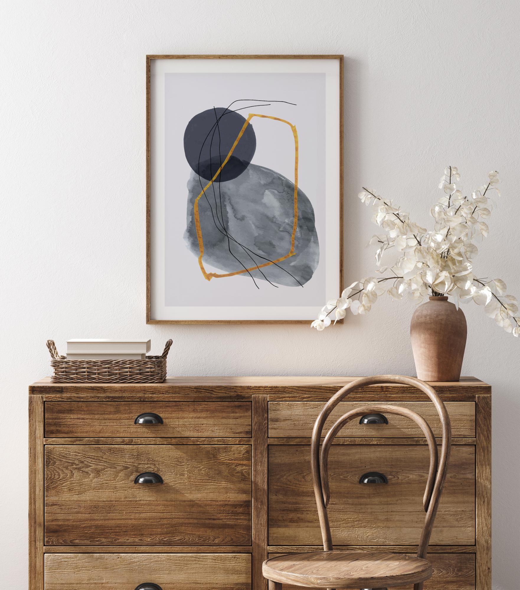 En geometrisk poster med olika blå former på en grå bakgrund. En stor målande blå form fyller skärmen med en mjuk grå cirkel ovanför den. Svarta linjer slingrar sig igenom och det finns en tjock gyllene linje som skapar en tredje form över toppen för en unik och intressant bild.
