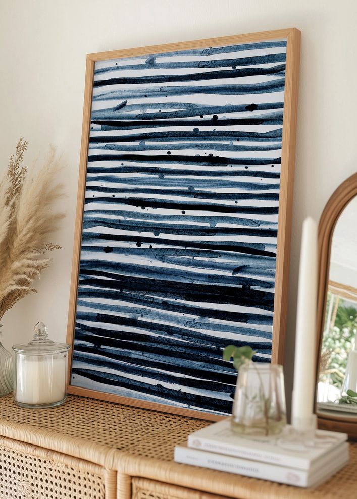 Motivet har en varierad färgpalett av mörk- och ljusblå toner som harmonierar med stänk av svart, vilket ger en sofistikerad och stilren effekt. Denna print är inte bara ett visuellt uttryck utan också ett samtalsämne som kan komplettera vilket rum som helst med stil och elegans.
