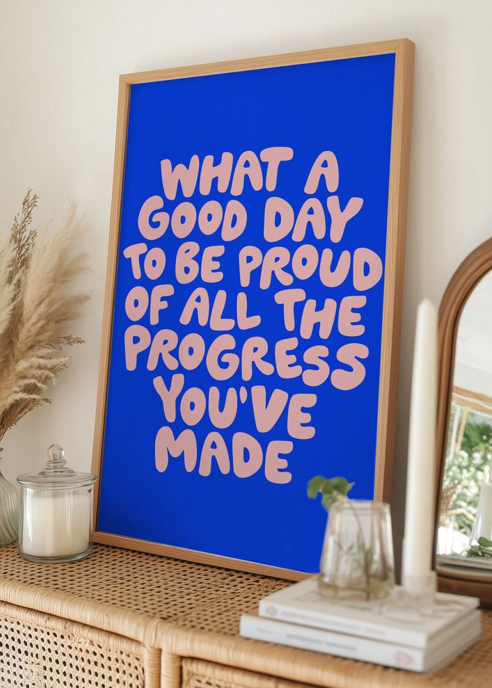 Denna inspirerande poster presenterar ett iögonfallande motiv där stora, bubbliga bokstäver i en ljus persikorosa nyans utgör ett kraftfullt budskap mot en djärv blå bakgrund. Texten "What a good day to be proud of all the progress you've made" uppmuntrar till reflektion och stolthet över framsteg, vilket gör detta print perfekt som inspiration i både hem och arbetsmiljö.