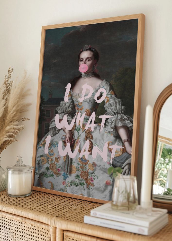 Denna poster fångar essensen av vintage och modern attityd i ett och samma tryck. Med ett sofistikerat porträtt som bakgrund förenas det historiska med det samtida genom en djärv text: "I DO WHAT I WANT". En perfekt kombination för de som söker något unikt att hänga på väggen. Trycket är lika humoristiskt som det är elegant, vilket skapar en konversationsstartare i vilket rum den än placeras.