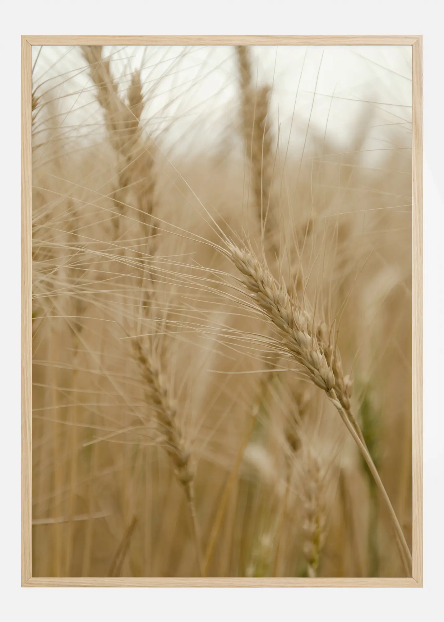 En poster med en närbild av ett vetefält. Vetekorn är detaljerade i förgrunden och har en fantastisk gyllene färg. De är riktade mot fjärran och visar hur stort vetefältet faktiskt är. En blek himmel ligger ovanför. Ta in naturen i ditt hem med denna enkla bild.