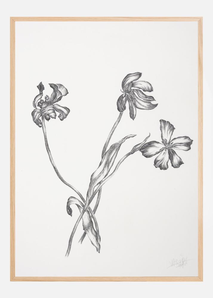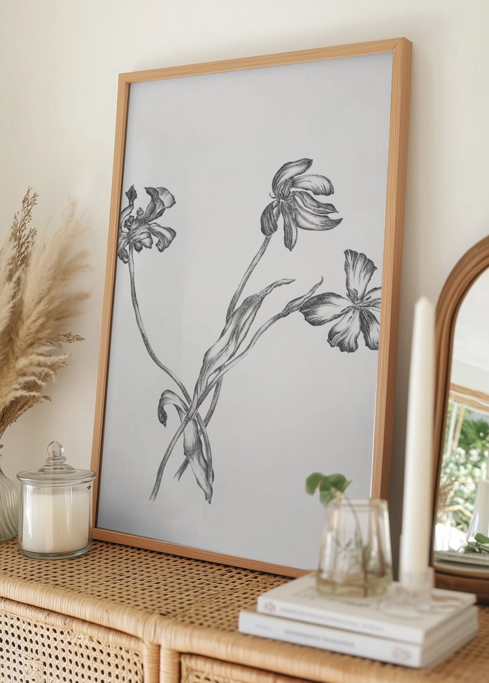 Denna stilrena poster presenterar en elegant illustration av tre blommor i en minimalistisk, svartvit färgskala. De detaljerade blommotiven fångar en tidlös skönhet och passar perfekt som en smakfull dekoration i hemmet eller kontoret. Varje blomma är noggrant avbildad för att ge ett realistiskt och konstnärligt intryck, vilket gör denna affisch till ett utmärkt val för de som uppskattar subtil elegans.