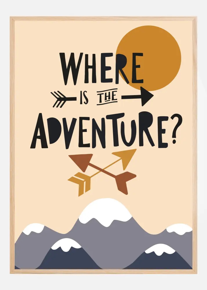 Denna inspirerande poster bjuder in äventyrslystna själar med sitt lockande budskap "Where is the Adventure?" i fetstil. Designen kombinerar geometrisk enkelhet med en lekfullhet som tilltalar drömmaren i alla åldrar. Posterns innehåll fokuserar på grafiska element som inkluderar en kompasspil, en paddel, ett tält, och några bergstoppar, vilka alla bidrar till en känsla av utforskning och upptäckt.