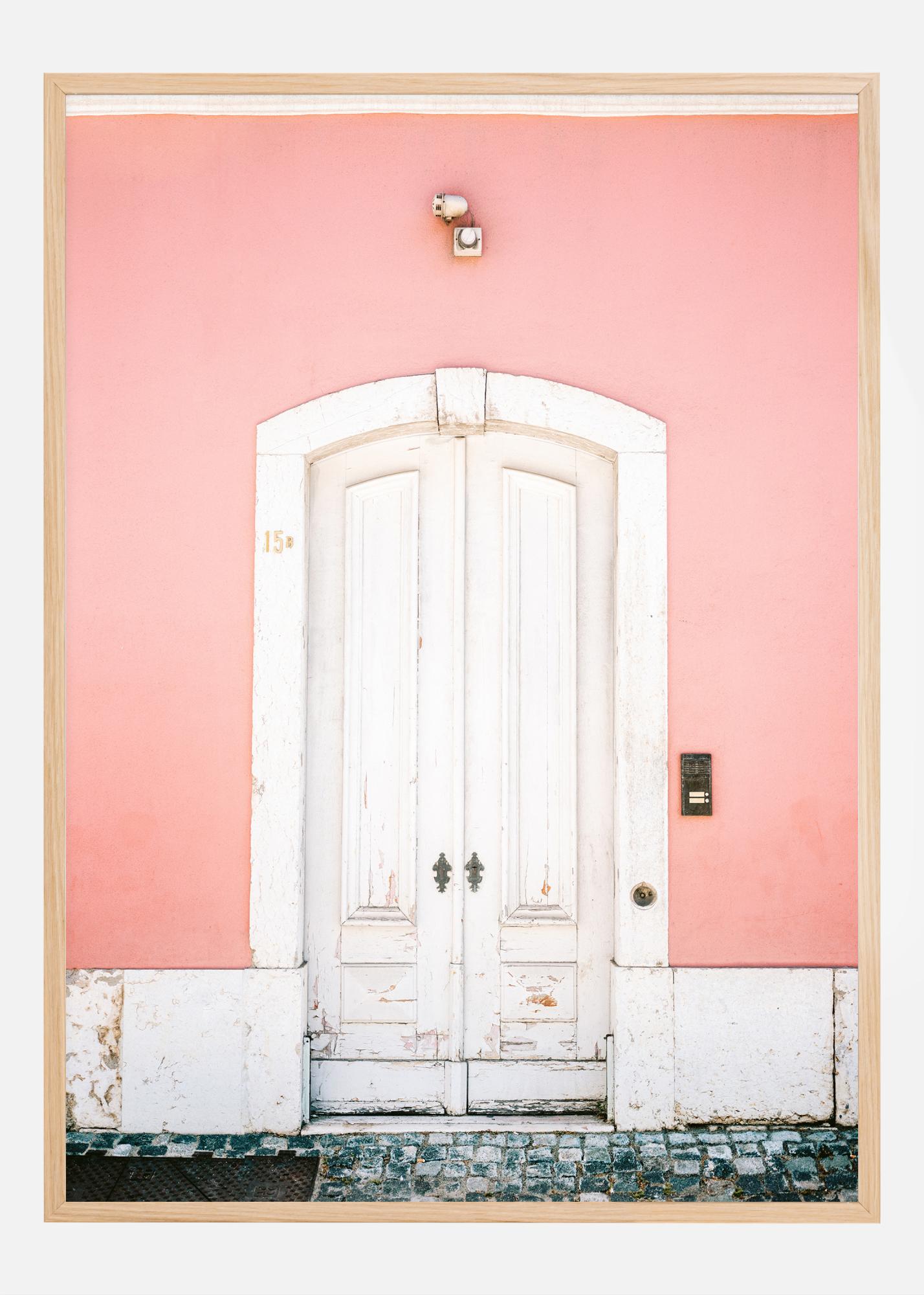Den här postern presenterar en vacker bild av en vit dörr mot en mjukt rosa vägg, en vy som andas den avslappnade och ändå eleganta stilen som är så typisk för Lissabon. Dörrens vitmålade yta, som visar tecken på patina och ålder, ger en känsla av historia och karaktär, medan de svarta järndetaljerna ger en klassisk touch. Husnumret "15" är diskret placerat till vänster om dörren, och den stenlagda trottoaren förstärker den europeiska stadsbildens charm.