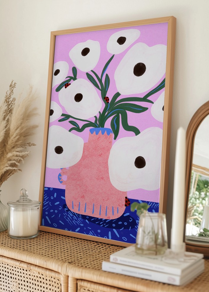 Den här affischen visar en livfull och modern design som fångar blicken med sina kontrasterande färger. Ett rosa vas fyllt med stiliserade blommor tar centrumplats på en livfull bakgrund. De vita blommorna har djärva svarta mittpunkter, vilket skapar ett dynamiskt visuellt intryck. Några små röda nyckelpigor med svarta prickar sitter charmigt på blommorna, vilket ger en lekfull touch till motivet. Affischen är perfekt för att ge ditt rum en modern och konstnärlig atmosfär.