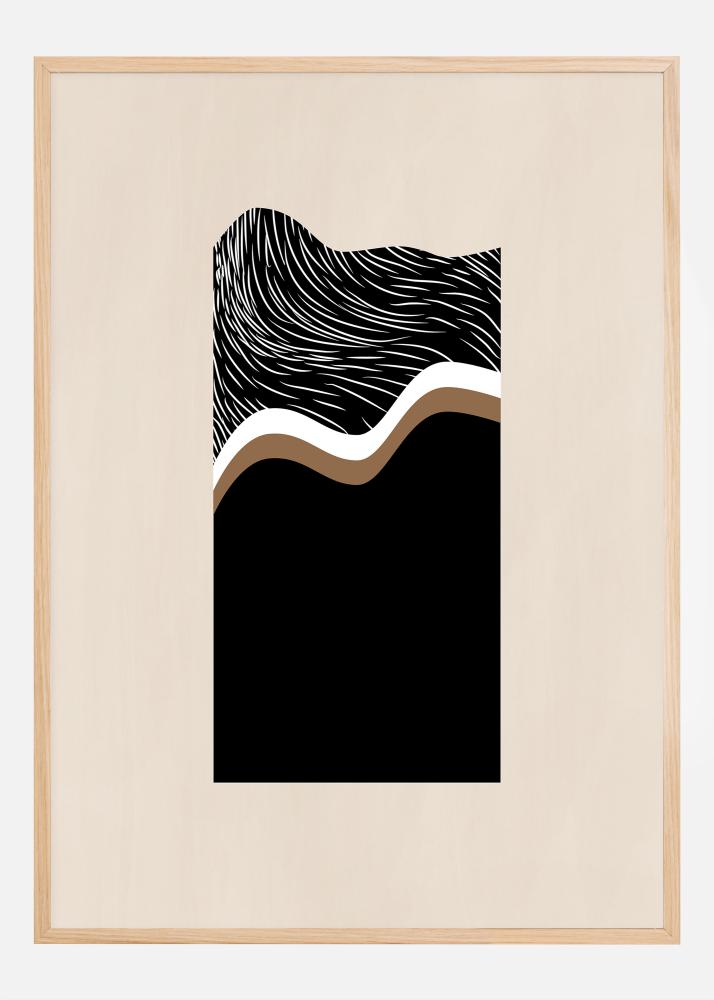 Den här postern kombinerar djärv grafik med en subtil färgpalett för att skapa en visuell kontrast som både är uppseendeväckande och elegant. Den svarta bakgrunden ger ett djup till konstverket, medan de dynamiska vita och guldbruna vågorna ger en illusion av rörelse. Denna minimalistiska men expressiva design är inspirerad av både den naturliga världen och moderna konstströmningar, och skulle vara ett slående tillskott i vilket modernt hem eller kontor som helst.