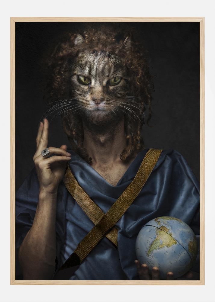 Denna unika affisch visar en säregen och tankeväckande bild där en katts huvud har placerats på en mänsklig gestalt. Motivet framställer en djup, mörk bakgrund som kontrasterar starkt mot figurens ljusa, skarpa blick. Den mänskliga delen av figuren är klädd i en rik blå tunika, kantad med gyllene detaljer som ger en känsla av elegans och styrka. Figurens hand håller en gammaldags världsklot, vilket tillför en dimension av visdom och världsomspännande insikt. I bilden dominerar färger som djupblå, guld, samt toner av brunt och beige vilka sammansmälter för att skapa en poster som är både mystisk och ikonisk.