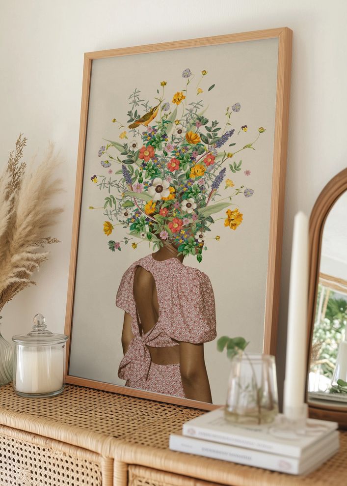 Denna unika affisch fångar en kreativ explosion av naturlig skönhet och färg. Motivet visar en kvinna vars huvud är ersatt av en blomstrande bukett fylld med olika blommor. Denna poster förmedlar en känsla av frihet och kreativitet, perfekt för att dekorera ett modernt hem eller kontor. Bilden förenar mode med natur i en djärv sammansättning som garanterat blir en samtalsstartare.