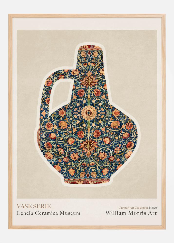 Denna postern, som är nummer 04 i "Curated Art Collection" från Lencia Ceramica Museum, är en rik och komplex hyllning till William Morris och hans betydande bidrag till mönsterkonsten. Här presenteras en stilfull vas, täckt av ett detaljerat och färgstarkt mönster som utstrålar den viktorianska erans fascination för orientalisk och medeltida konst, en stil som Morris hjälpte till att popularisera.