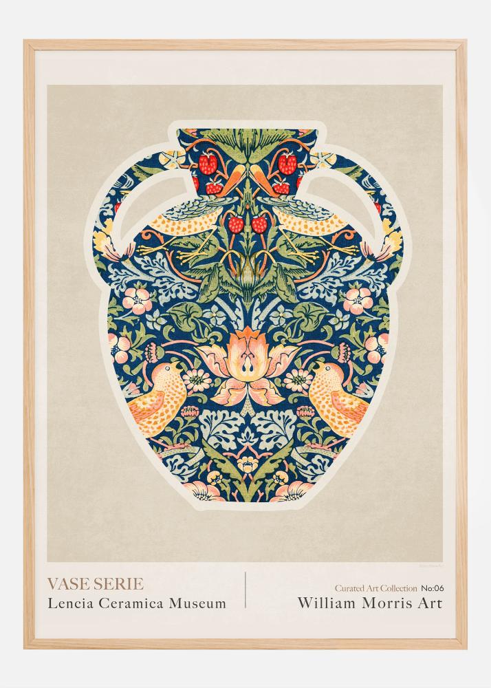 Poster nummer 06 i vår "Curated Art Collection" vid Lencia Ceramica Museum är en riklig hyllning till William Morris' konsthantverk. Den framställer en vas prydd med ett symmetriskt och detaljerat mönster, livfullt med motiv av fåglar och blommor som är ikoniska för Morris' designfilosofi. Varje element i detta mönster är genomtänkt för att hylla naturens skönhet och konstens förmåga att imitera den.