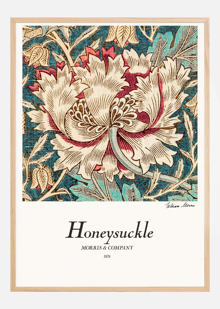 Denna poster presenterar "Honeysuckle", ett utsökt mönster av William Morris, skapat för Morris & Company 1876. Mönstret är en rik väv av blomster, med kaprifolens svepande kurvor och blommor i vackra nyanser av rött, kräm och blått. Bakgrunden, i en djupare blå ton, framhäver de elegant formade blommorna och bladen, och skapar en djup och komplex komposition som är både iögonfallande och tidlöst vacker.