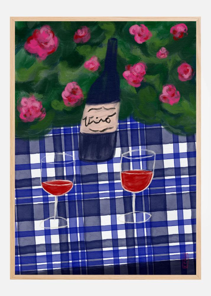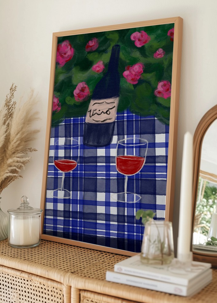 Motivet kännetecknas av djupa röda och rosa nyanser från rosorna, som harmoniserar med de rika bourgogneröda tonerna i vinet. Den blå-vita rutiga duken skapar en fräsch och inbjudande kontrast. Denna affisch är ett levande tillskott till varje utrymme, och dess livfulla färgpalett fångar ögat på ett oemotståndligt sätt.