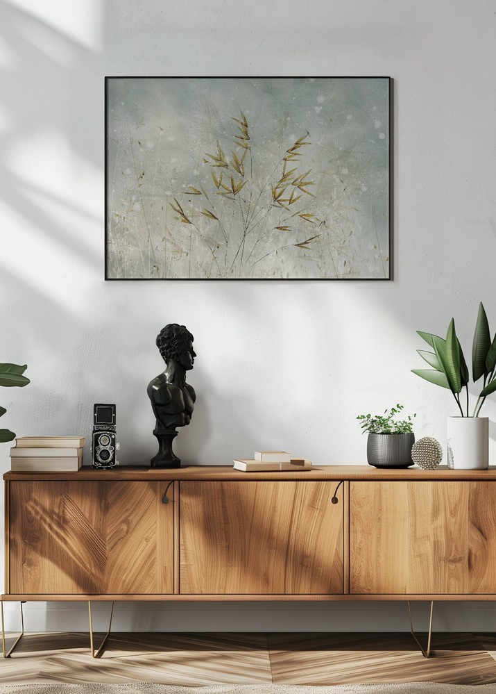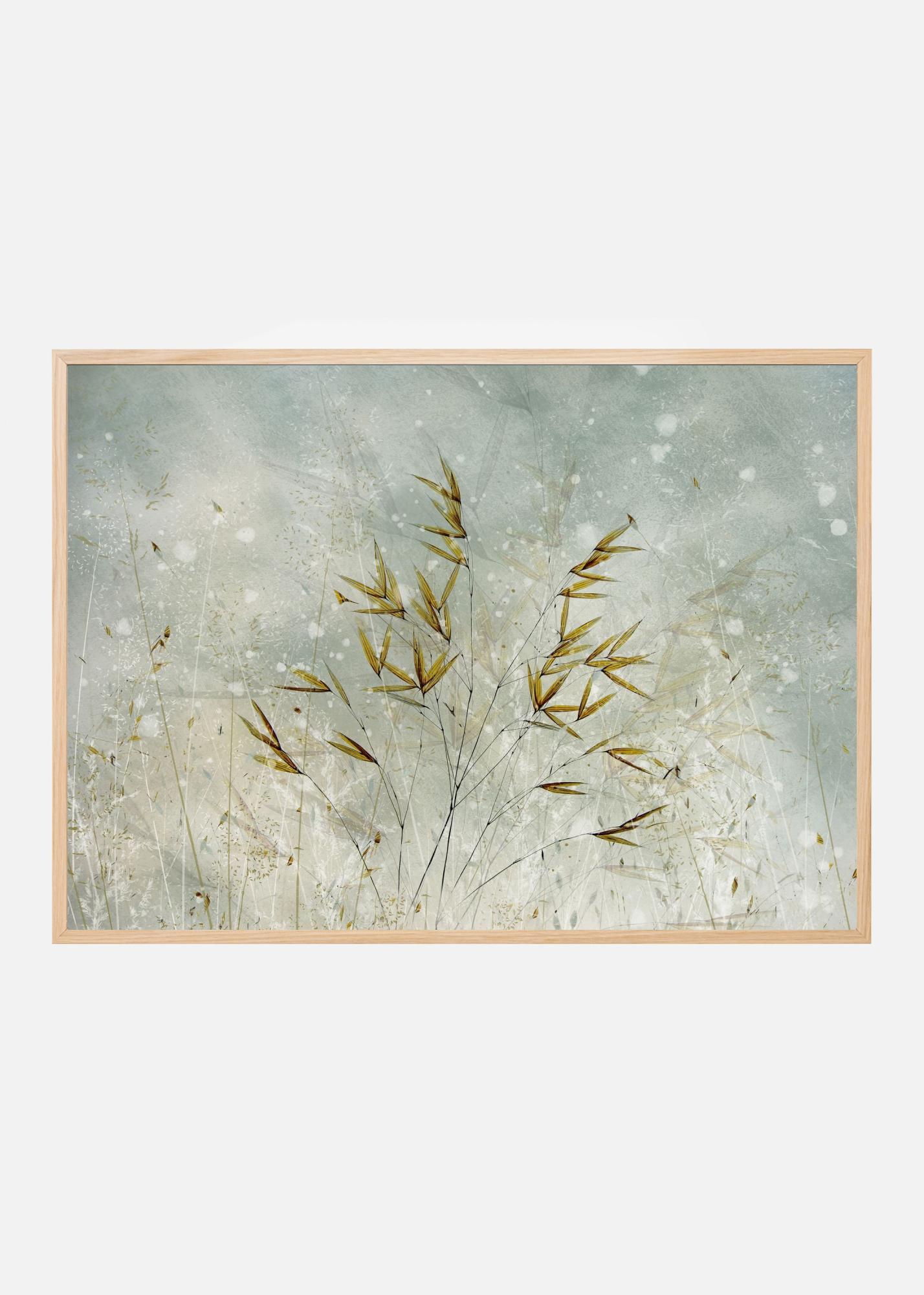 Denna eleganta poster fångar skönheten i naturens enkelhet med sina böljande grässtrån som sträcker sig mot himlen. Färgpaletten domineras av dämpade gröna och beige toner, vilket skapar en lugn och harmonisk känsla. Det subtila mönstret av vitt och ljusgrått i bakgrunden tillför en mjuk kontrast, vilket gör denna affisch till ett perfekt tillskott i alla rum som behöver en touch av naturinspirerad dekor.