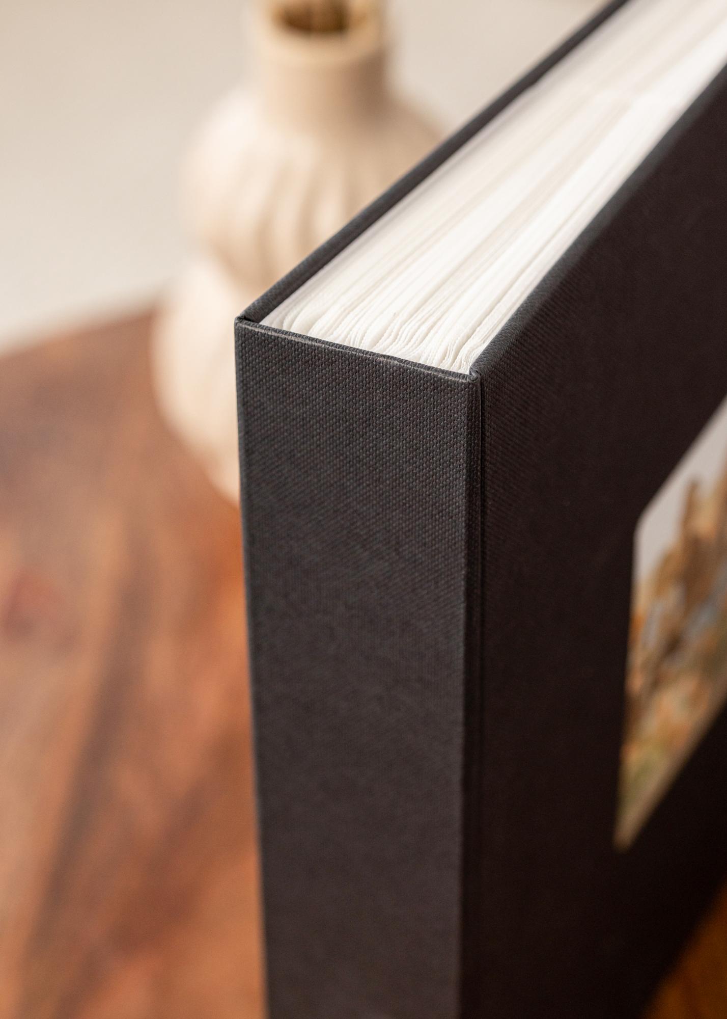 Albumets pärmar är i en klassisk svart färg som ger en tidlös och sofistikerad känsla. De vita sidorna inuti albumet skapar en vacker kontrast och framhäver dina bilder på bästa sätt. Bildorienteringen i albumet är både liggande och stående, vilket ger dig flexibilitet att arrangera dina foton precis som du vill.