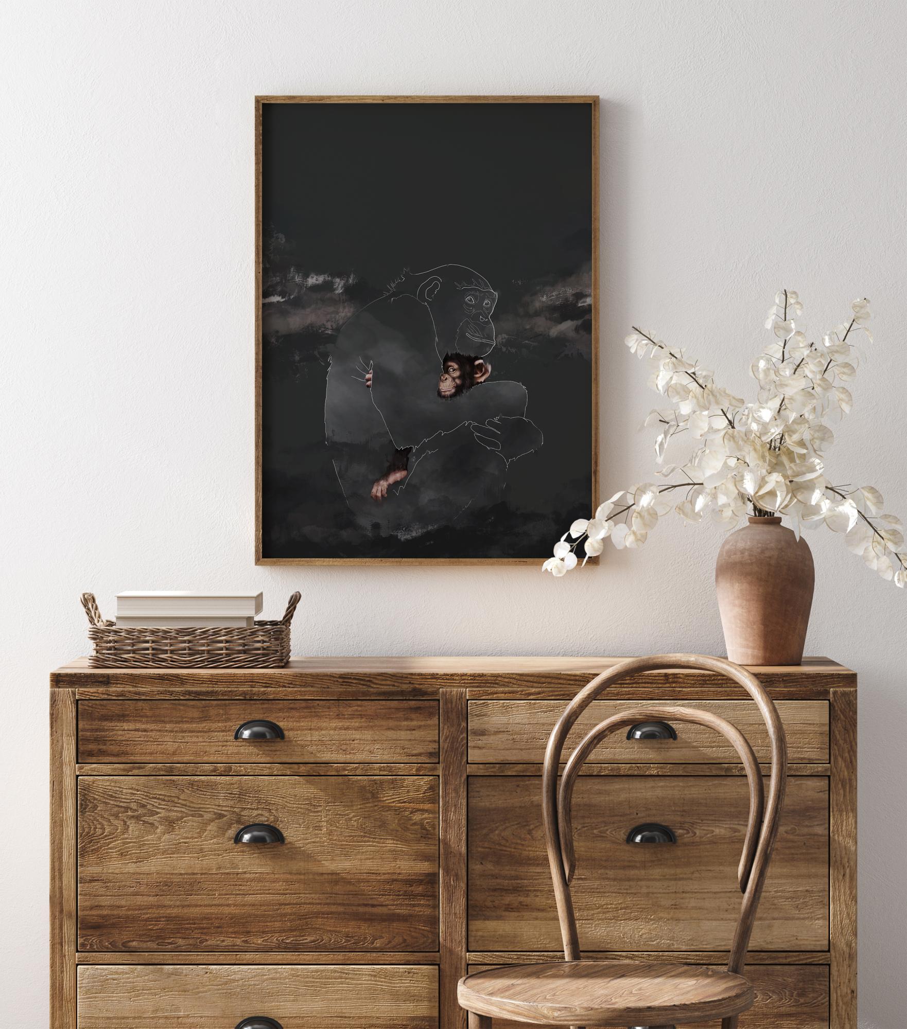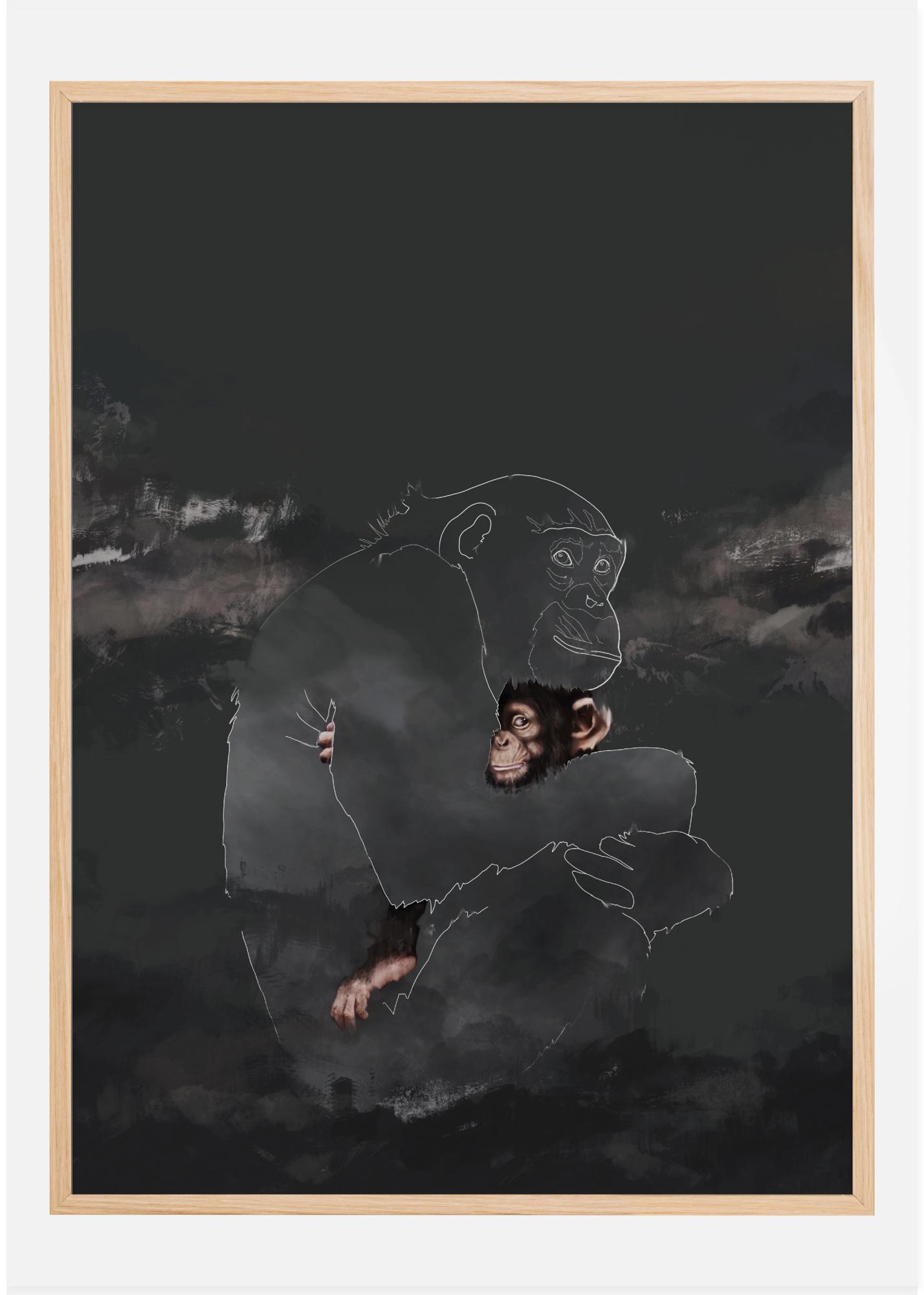 En känslosam poster med en schimpansbebis som kramar om den saknade bilden av sin mamma. Det här är en gripande bild när schimpansebarnet kramar om ingenting annat än konturerna av sin mamma som sitter på mjuka moln i den svarta himlen.