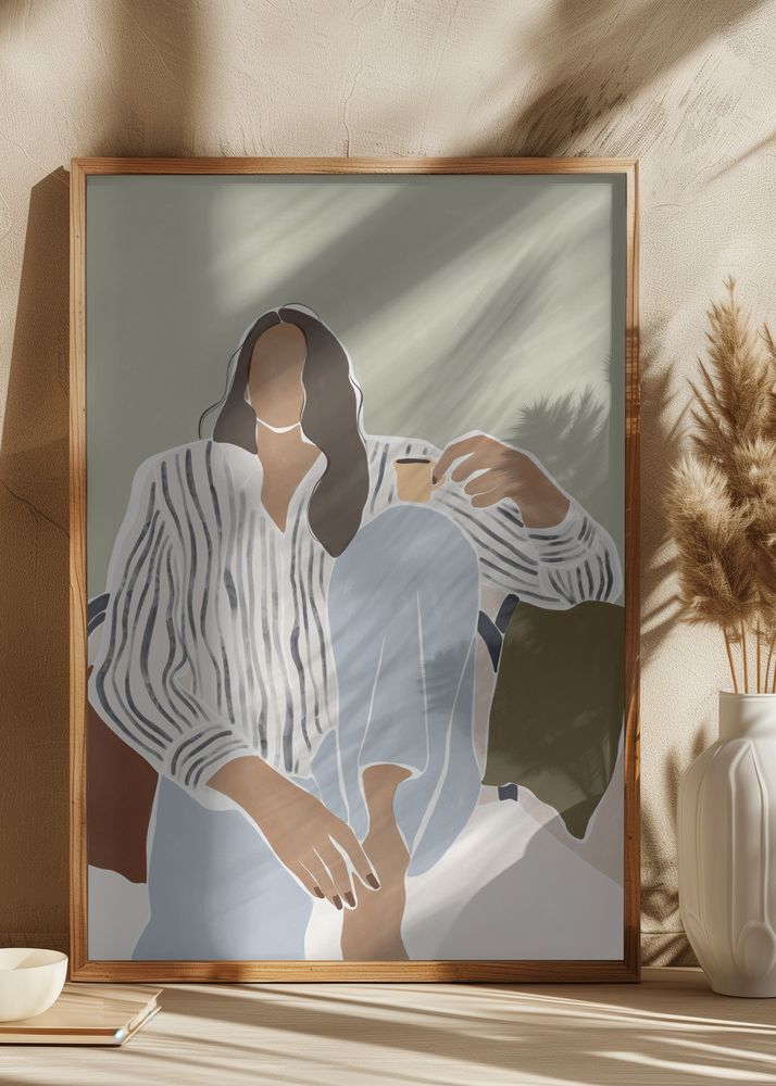 Denna stilfulla poster framställer en modern och avslappnad kvinna som sitter med en kopp i handen, vilket ger en hemtrevlig och mysig atmosfär. Den enkla illustrationen med mjuka linjer och lugna pastelltoner tillför en tidsenlig elegans till din väggdekoration. Den abstrakta designen är minimalistisk samtidigt som den förmedlar en känsla av lugn och eftertanke.