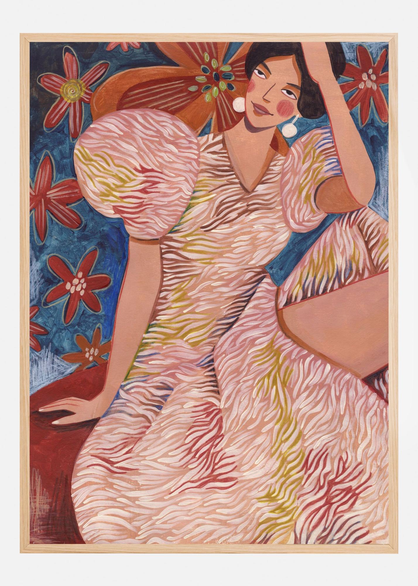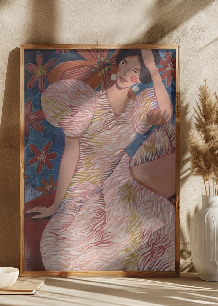 Färgerna i denna print är varmt sammanflätade i en harmonisk palett, med nyanser av terrakotta, mjuka rosa och cremevita som dominerar klädnaden, medan figurens hudtoner är återgivna i en varm beige. Bakgrunden avbildas med himmelsblå och djupröda toner som kompletteras med dekorativa blommönster i äppelgrönt, gult och vitt, vilket bjuder in till en blommig atmosfär. Denna affisch är en sann färgfest och en visuell berättelse som kommer att berika varje samlingsvägg eller enskild framträdande plats i hemmet.