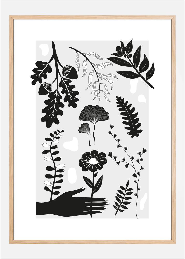 En djärv poster med svartvita figurer av olika blad, växter och blommor. En svart hand sträcker sig ut för att ta tag i en av de stiliserade blommorna. Ekollon, blommor, ormbunkar med mera fyller det här enkla men intressanta trycket. Få dig själv på ett botaniskt humör när du hänger den här växtpostern i ditt hem.