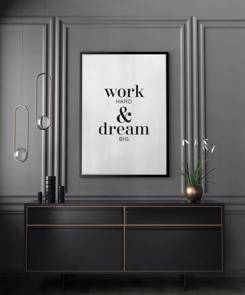 En inspirerande poster med ett starkt citat för att kickstarta din dag. Work Hard and Dream Big är ord som du bör använda för att få igång dig själv varje morgon. Häng den här i ditt kök så att du kan bli motiverad till ditt morgonkaffe.