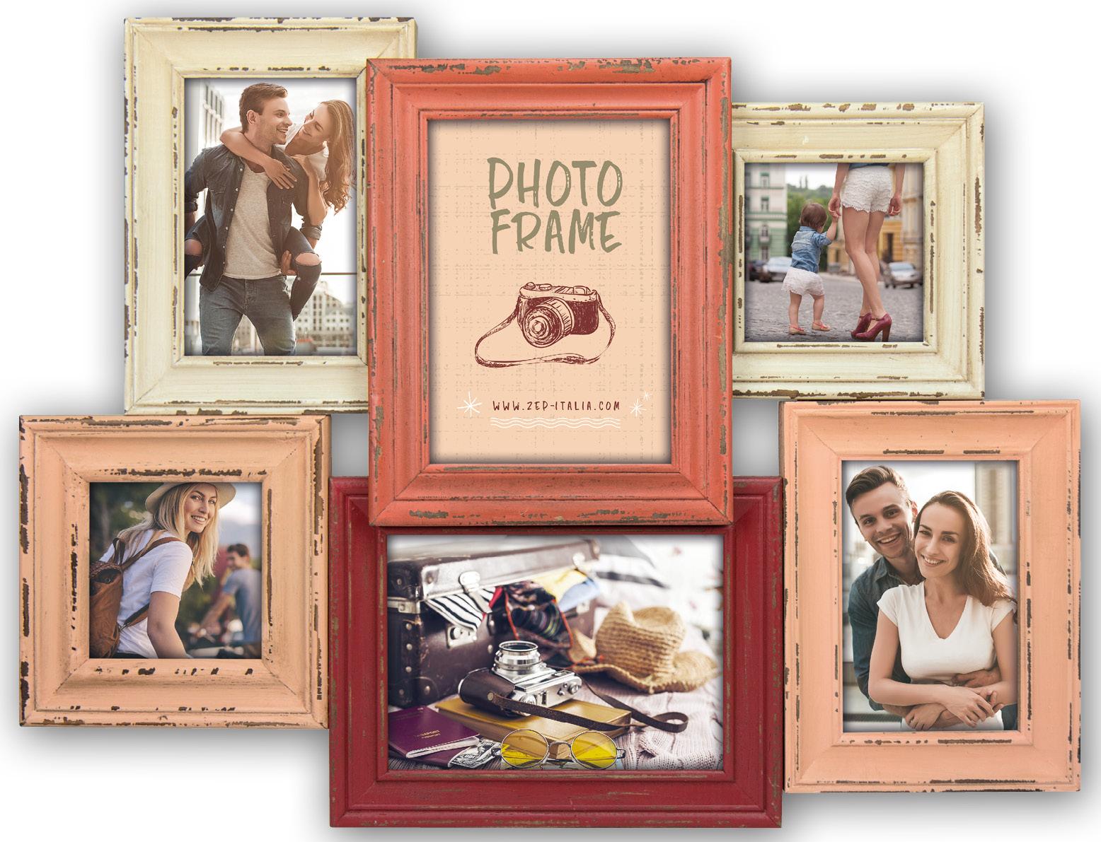 Detta är en snygg och rustik collageram i olika nyanser av röd och creme. Collageramen har plats för 6 bilder i bildstorlekarna 10x10 cm, 10x15 cm och 13x18 cm. Ramens yttermått mäter 54,5x41,5 cm. Ramen har lite sliten design vilket förstärkes dess unika karaktär och kommer att göra den till ett blickfång i ditt hem. Väggfäste finns.