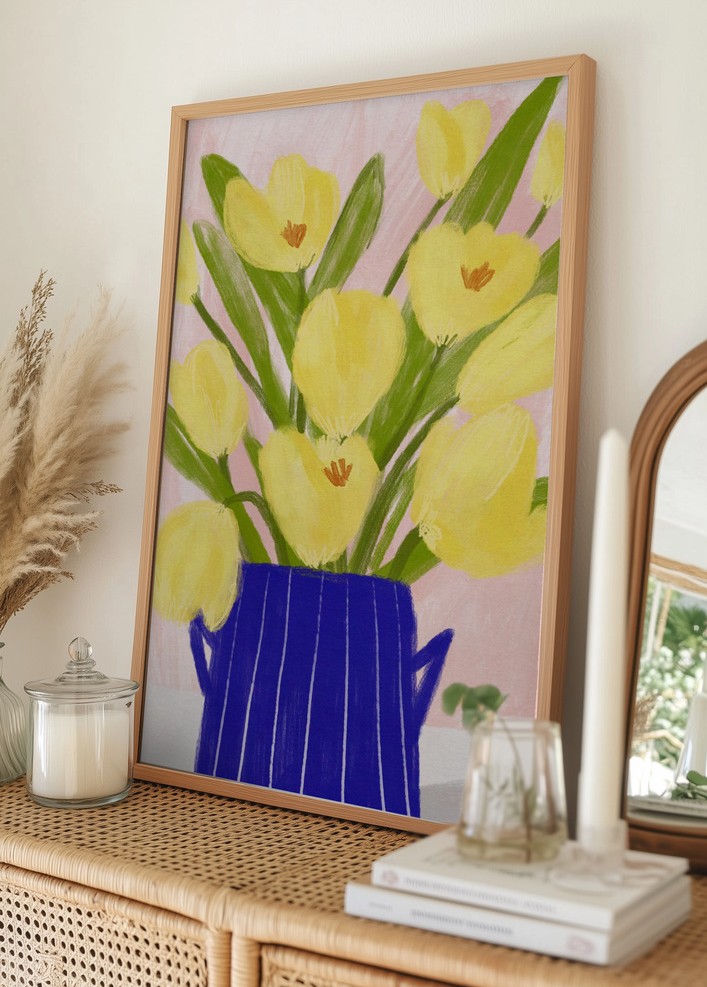 Den djupblå vasen med vita ränder tillför en elegant detalj och skapar en härlig kontrast mot de ljusa blommorna och den varma bakgrunden. Denna print är ett idealiskt val för dem som vill lägga till en touch av natur och stil till sina väggar. Kombinationen av gula, gröna, rosa och blå nyanser skapar en harmonisk och iögonfallande visuell upplevelse som passar perfekt i ett modernt hem.