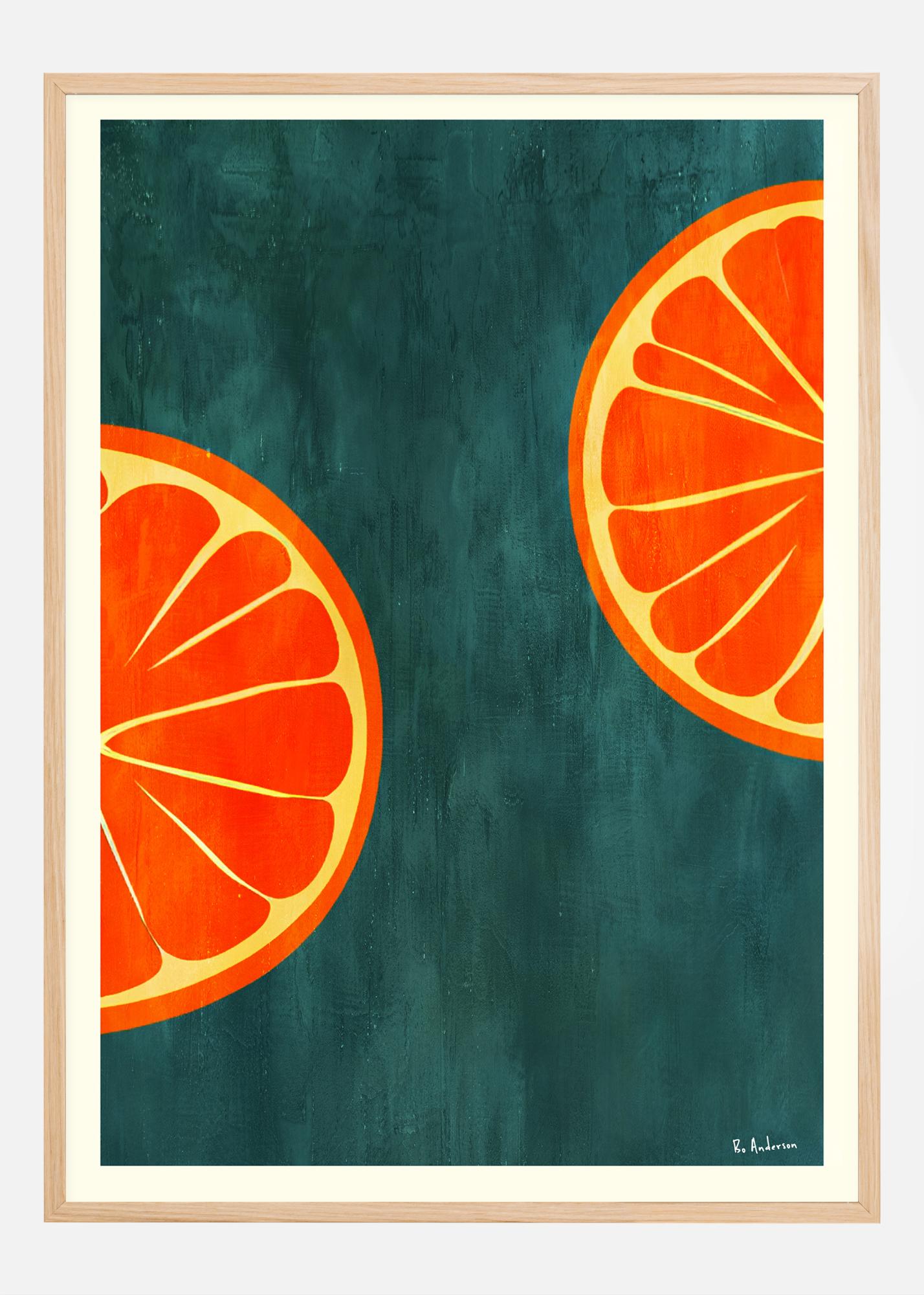 Denna ljusa och uppfriskande poster framställer två halverade apelsiner mot en mörkgrön bakgrund, en bild som är lika energigivande som en glas färskpressad juice. De rika, livfulla orangetonerna i apelsinskivorna poppar mot den djupa bakgrunden och skapar en bild som är både enkel och slående. Det är en design som firar naturens enkelhet och skönhet, och den kunde inte vara mer perfekt för att ljusa upp ett kök eller matsal med en touch av färg.